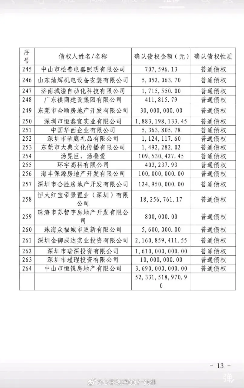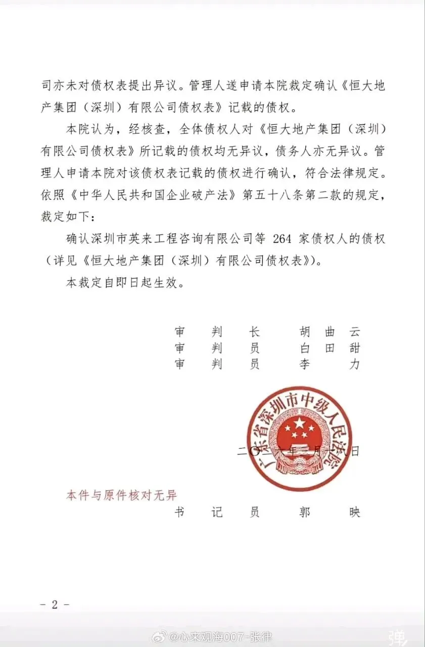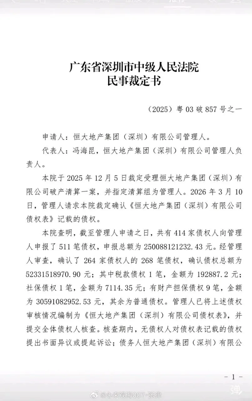 2025年12月5日,深圳中院裁定受理该案,指定清算组为管理人;2026年1月完成首次债权人会议,累计申报债权511笔、总额约2500亿元,经审查确认债权超500 亿元。这是恒大体系风险出清的标志性节点,也意味着这家曾深耕深圳的区域平台,依法进入资产处置、债权清偿阶段。