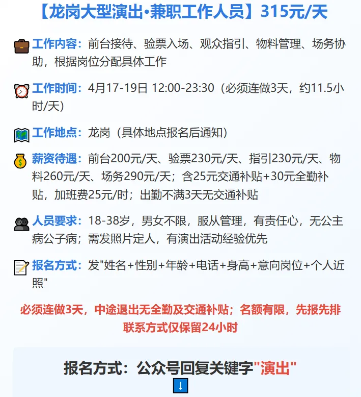 【深圳兼职】龙岗大型演出·工作人员兼职丨315元/天;涵盖前台/验票/指引/物料/场务等,含25元交通补贴+30元全勤补贴.