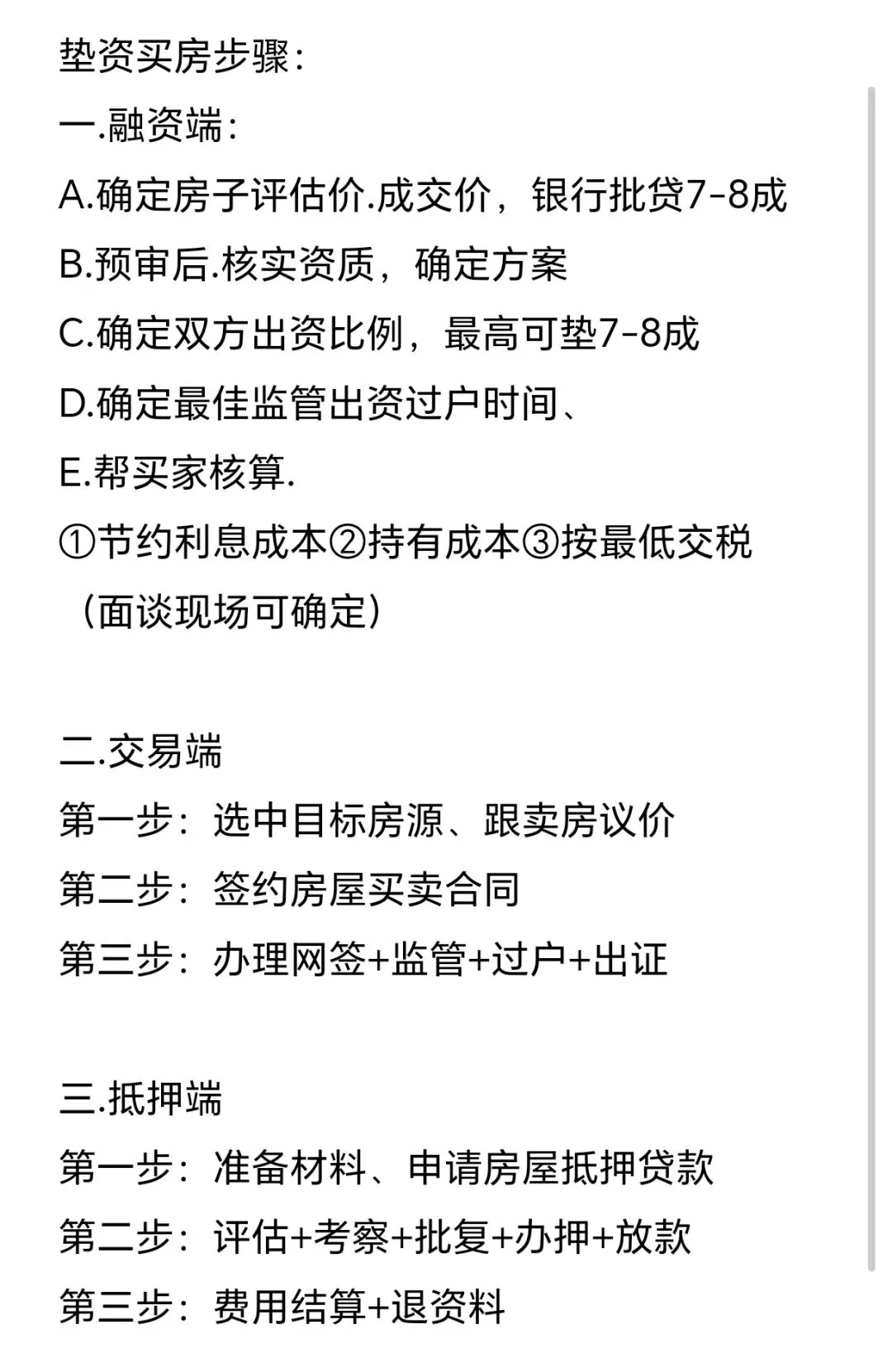 简单的来说,就比如我们如果打算在深圳买套房,经过详细的成本核算后,发现如果全款购买这套房子那“税费低.总价低.持有成本.利息也低”,这个时候手上如果没那么钱。就可以找金融公司来帮忙支付房屋总价剩下的资金,以全款的方式买下房子,过户以后再把房子拿去银行做抵押,将房子贷出钱以后再归还金融公司的垫资。(无月供能力.无基本的首付比例.纯套现薅羊毛的勿扰)