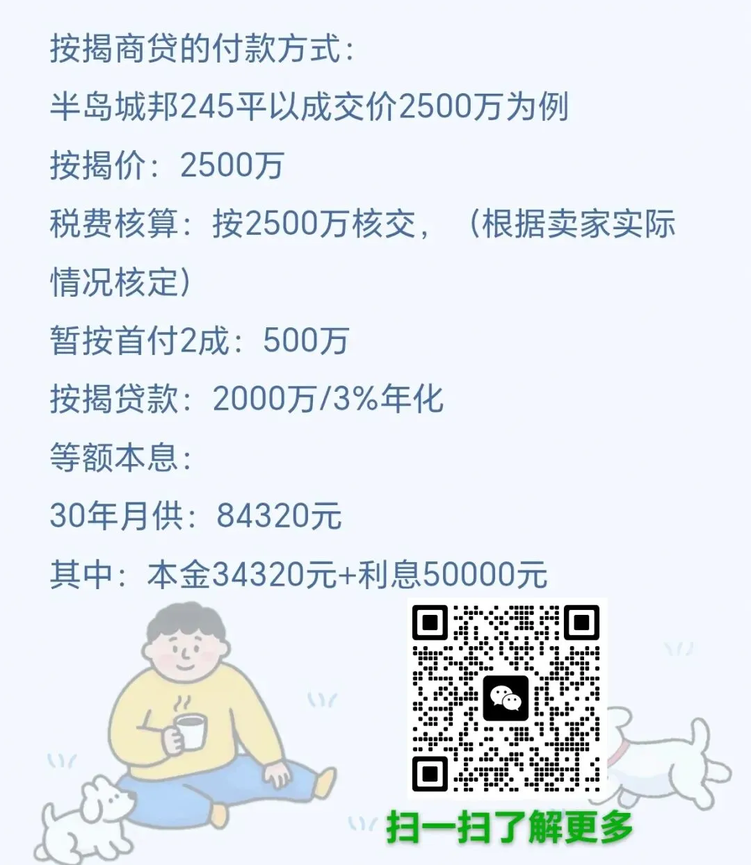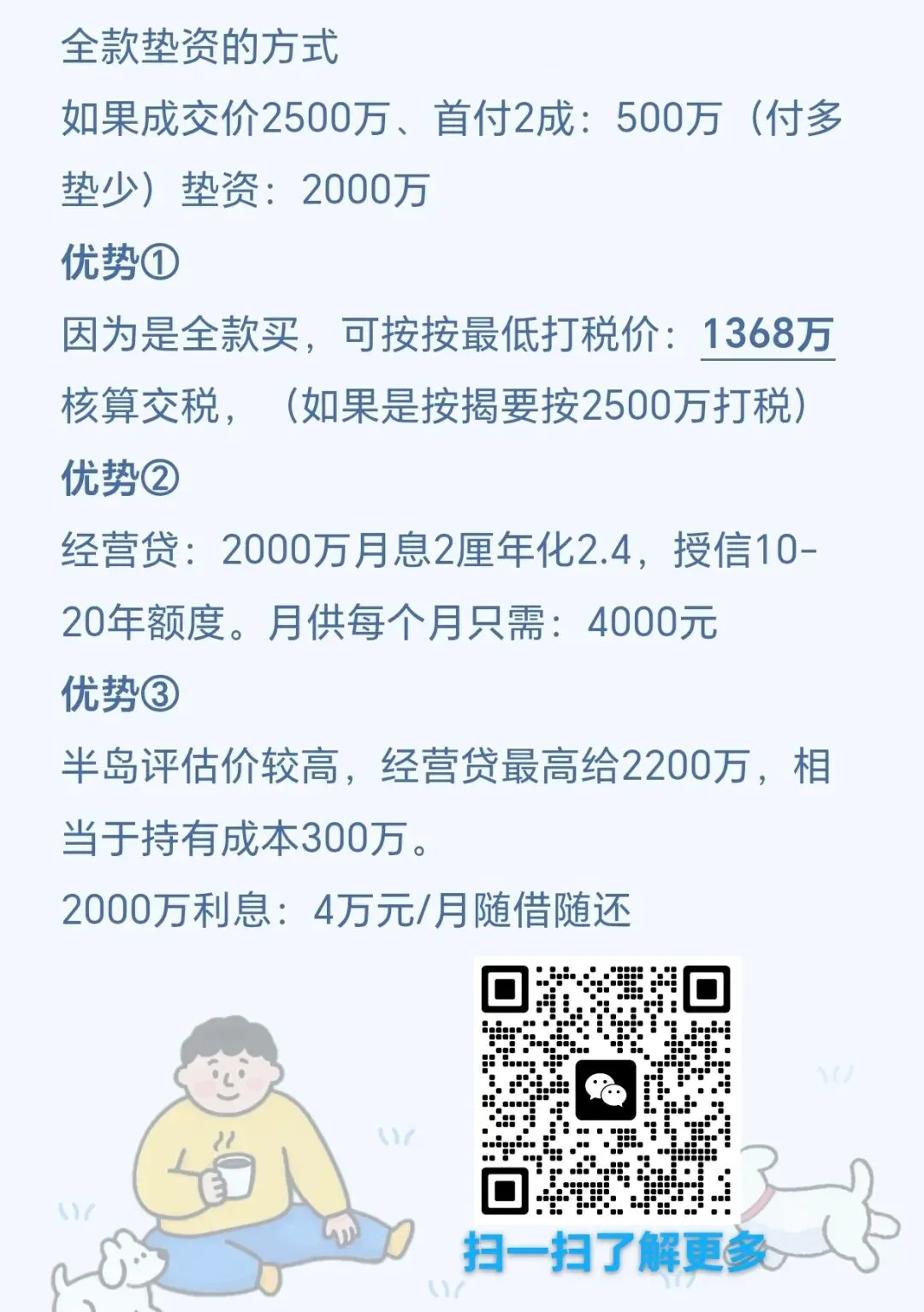小编以半岛城邦250平成交价2500万例,不同的付款方式,税费月供都不一样,以下图片仅供参考一下:如果大家选择全款垫资,建议前期做好详细的规划。也可以用卖家房产证让抵押贷款的银行先预审。具体可以私聊小编。