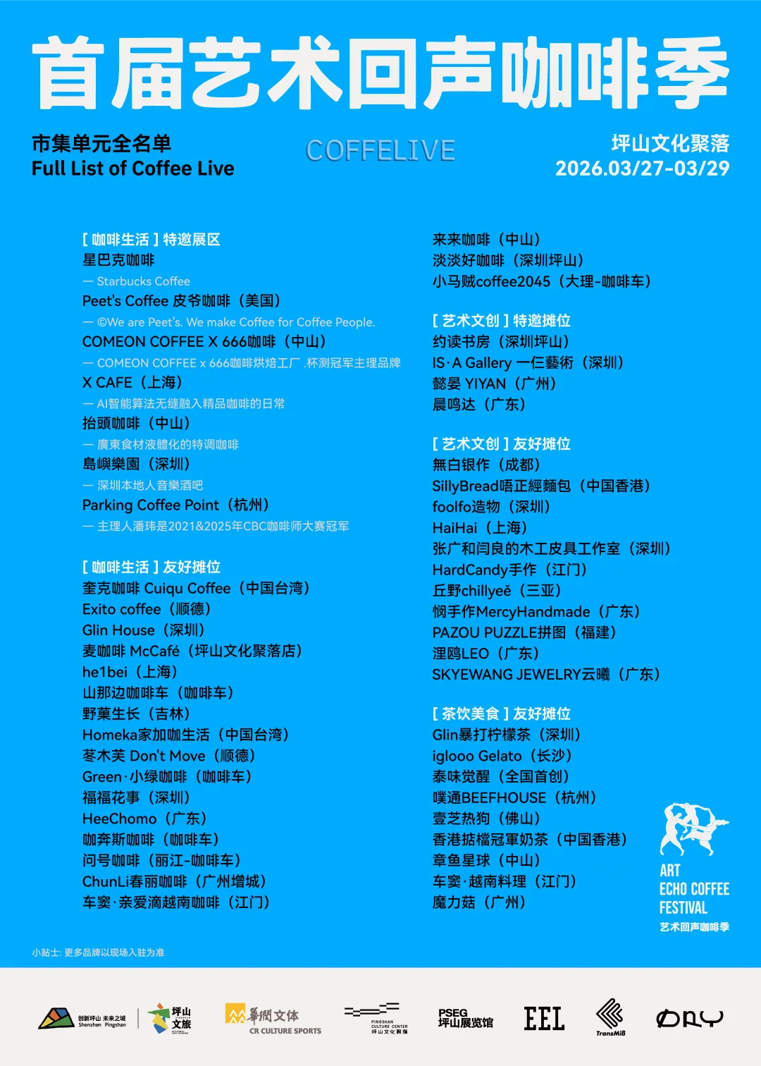 坪山首个大型咖啡主题市集、中国首个策展型艺术咖啡季 —— 天空现场来袭!以 “蓝色灵感” 为主线,汇聚了星巴克、皮爷咖啡、X CAFE、666咖啡、Parking Coffee Point、抬頭咖啡来来咖啡、岛屿乐园、一仨艺术等50余家精品咖啡、艺术文创与茶饮美食品牌。