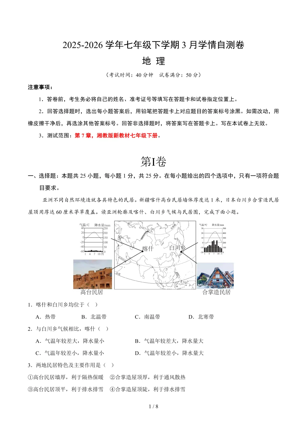 七年级地理下学期3月学情自测卷