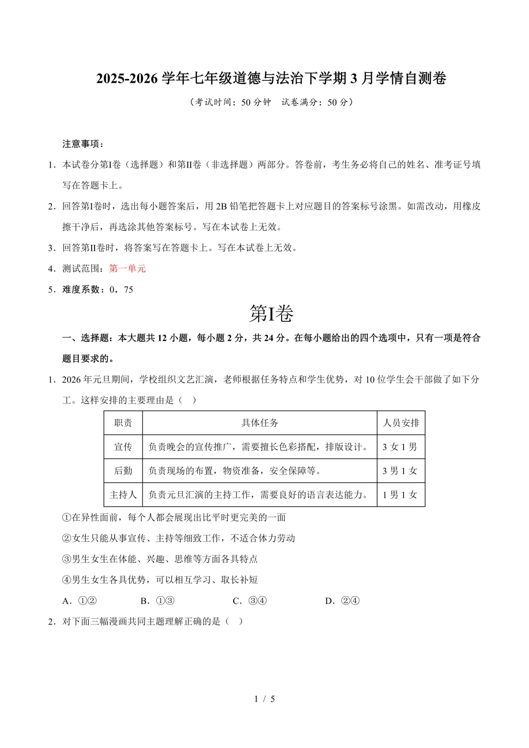 七年级道德与法治下学期3月学情自测卷