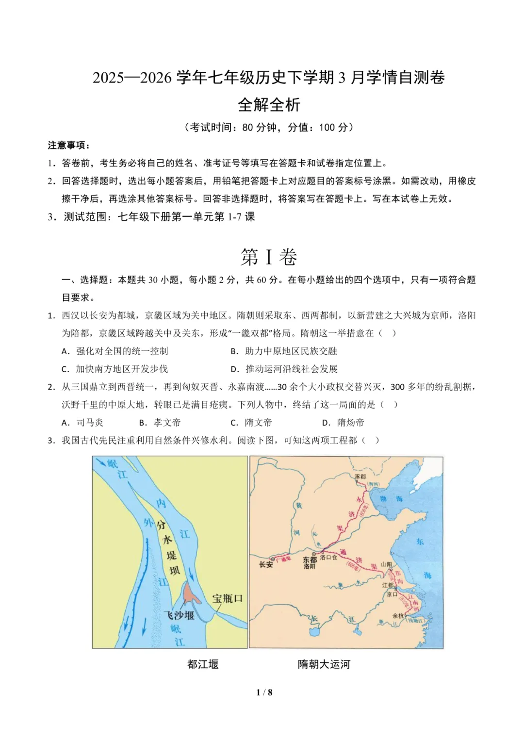 七年级历史下学期3月学情自测卷