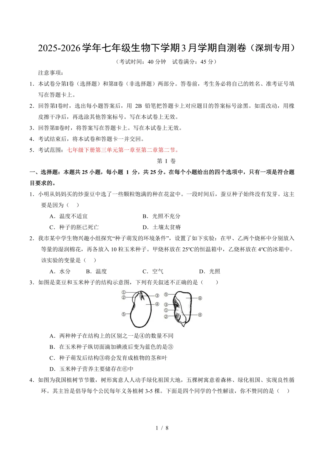 七年级生物下学期3月学情自测卷