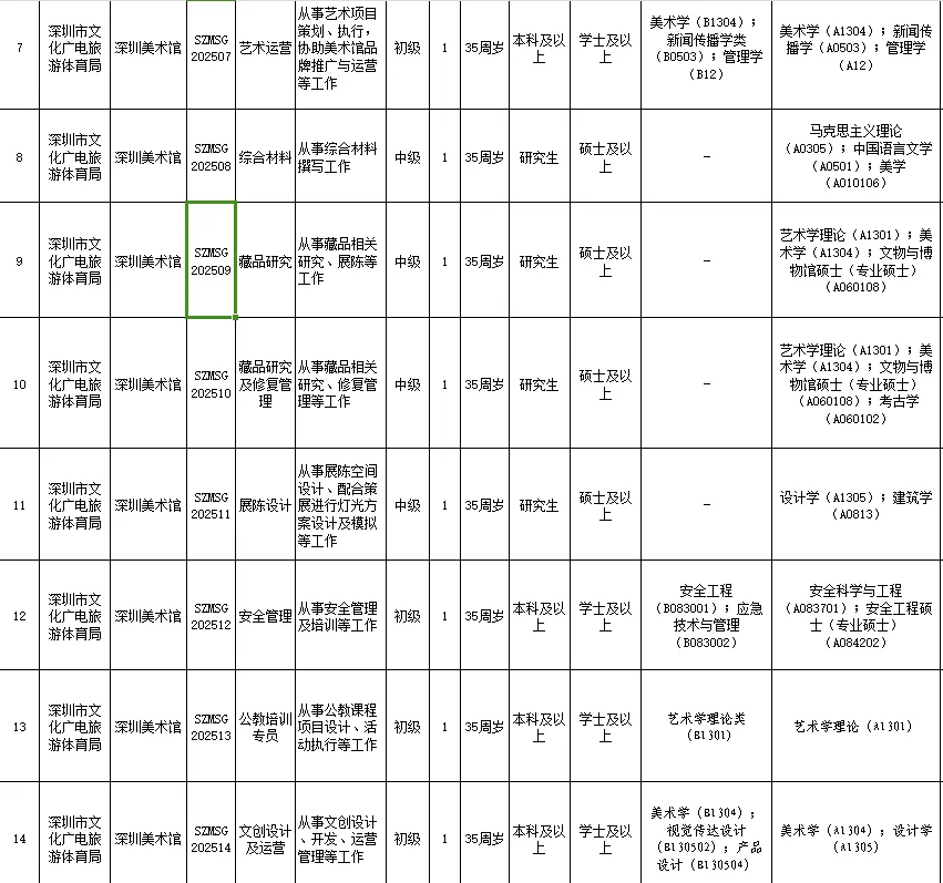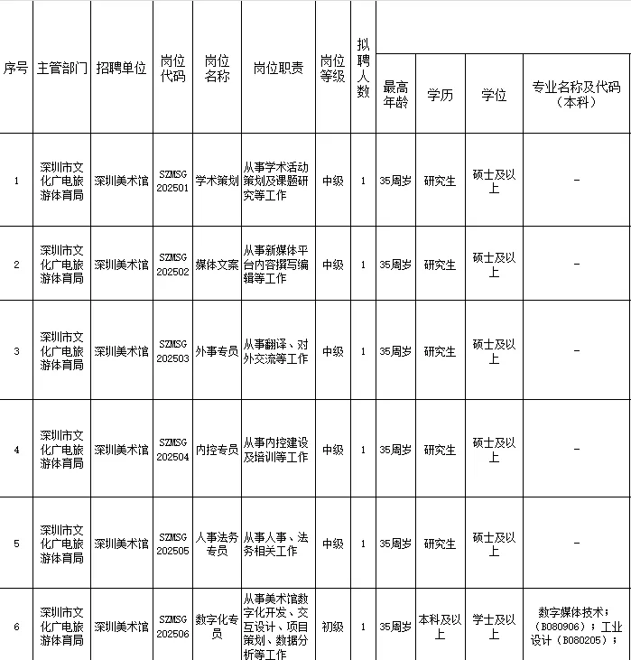 写在最前:正经事业编,专业挺小众的。建议除了体制外符合条件的,还有在没落国企里符合条件的同事都积极报名试试。本次招聘实行网络报名。应聘人员请于2025年7月1日9:00至7月7日16:00登录报名网站(http://zlbm.ikaowu.com/exam/504)报名。根据工作需要,深圳美术馆拟公开招聘14名员额工作人员。参照《广东省事业单位公开招聘人员办法》(广东省人民政府令第301号)有关规定,现将深圳美术馆2025年公开招聘员额工作人员有关事项公告如下:(一)招聘岗位及数量:公开招聘14名员额工作人员,应聘人员可通过报名网站(http://zlbm.ikaowu.com/exam/504)、深圳美术馆网站(www.szartm.com)查阅具体的招聘岗位、人数和报考资格条件。(1)应聘人员的所学专业须与岗位要求的专业相符。专业是否相符可参考《广东省2025年考试录用公务员专业参考目录》(附件2)。所学专业以应聘人员毕业证书上注明的专业为准,应聘人员可根据岗位设置的专业名称及代码对照附件2。如所学专业未包含在目录中,可选择专业目录中的相近专业报考,所学专业必修课程须与报考职位要求专业的主要课程基本一致,需提供毕业证书、所学专业课程成绩单、课程对比情况说明等材料。(2)所学专业必须与岗位要求的学历层次相对应。如岗位要求学历为“研究生”,专业为“美术学”,若报考者本科的专业为“美术学”,但研究生的专业为“心理学”,则不符合要求。 2.应聘人员所持有的专业技术资格证书须与岗位要求的专业技术资格相符。3.报考年龄。年龄计算截止时间为2025年7月1日,如最高年龄为35周岁,指未满36周岁,即1989年7月1日以后出生。符合本公告及报考岗位所要求条件的人员均可报考。应聘人员须于资格审核结束前取得相应毕业证书、学位证书及岗位要求的其他证明材料。本次招聘实行网络报名。应聘人员请于2025年7月1日9:00至7月7日16:00登录报名网站(http://zlbm.ikaowu.com/exam/504)报名。应聘人员只能选择一个岗位报名。报名期间,在未完成报名信息和岗位确认的情况下,可修改姓名、身份证号、证件类型、手机号码外的其他信息及岗位信息,岗位提交确认后不可修改报名信息和报考岗位。未在规定的报名期间完成岗位选报的,视为放弃报名。网上报名需要提交的扫描资料包括身份证、学历学位证书、专业技术资格证书、工作经历证明材料等。2025年7月5日将公布一次无人报考的岗位(如没有无人报考岗位,报名期间将不公布),2025年7月7日17:30后将公布各岗位的最终报名人数。报名成功的应聘人员请于2025年7月10日10:00后登录报名网站(http://zlbm.ikaowu.com/exam/504)自行下载打印准考证。准考证是参加本次公开招聘的重要证件,请应聘人员妥善保管。1.报考人员凭本人准考证和有效居民身份证原件(两证缺一不可)参加笔试,笔试考场规则详见准考证。2.笔试主要测评综合知识与基本能力。应聘人员须按准考证上确定的时间、地点和其他要求参加笔试。3.笔试时间:2025年7月12日上午9:30—11:00。笔试合格分数线及资格审核名单将于2025年7月23日后公布在报名网站(http://zlbm.ikaowu.com/exam/504)及深圳美术馆网站(www.szartm.com),应聘人员可登录系统查询本人笔试成绩及岗位排名。1.面试对象。在笔试合格的应聘人员中,根据笔试成绩由高到低的顺序,按照每个岗位拟聘人数1:5的比例确定入围面试人员名单。笔试合格人数未达到上述比例的,将全部笔试合格人员确定为入围面试人员。2.资格审核。资格审核时间为2025年7月28日。面试前,招聘单位及其主管部门须对入围面试人员进行资格审核。证件(证明)不全且不能在资格审核结束前补全的或与报考资格条件不符的,取消面试资格。因入围面试人员不符合招聘条件被取消面试资格的,招聘单位将在同一岗位笔试合格的应聘人员中,根据笔试成绩由高到低的顺序依次递补。 资格审核是对报考者提供材料的初步审查,最终以办理聘用手续前的考察和备案结果为准。3.面试组织:面试采取结构化面试方式组织进行,面试具体安排另行通知。面试对象未按规定时间参加面试的,视为自动放弃。面试成绩当场公布,面试合格分数线为60分。考试综合成绩=笔试成绩×50%+面试成绩×50%。如同一岗位应聘人员综合成绩相同的,则按照笔试成绩由高到低的顺序确定名次;如笔试成绩仍然相同的,则以面试主评委评分由高到低的顺序确定名次;如面试主评委评分仍然相同的,则另行组织面试。在考试综合成绩合格的应聘人员中,按照综合成绩由高到低的顺序确定与招聘岗位数量等额的体检人员,并按规定组织体检。不按时参加体检者,视为自动放弃。招聘单位根据体检结果确定考察人选并按规定进行考察。考察不合格的,取消聘用资格。拟聘人选名单将在深圳美术馆网站(www.szartm.com)公示,公示时间为5个工作日。公示期满,没有异议或者异议不影响聘用的,由招聘单位办理聘用手续。公开招聘的人员按照规定实行试用期制度。试用期包括在聘用合同期限内。试用期满不合格的,取消聘用。 因应聘人员体检、考察不合格、在公示期间被投诉而取消聘用资格、自愿放弃等情形空出的招考名额,招聘单位可以另行招考,也可以从面试入围且面试成绩在面试合格分数线以上人员中按总成绩排名顺次递补。(一)本次招聘实行诚信报考,资格审核贯穿招聘工作全过程。报考人员应认真阅读公告及岗位要求,对所提供的