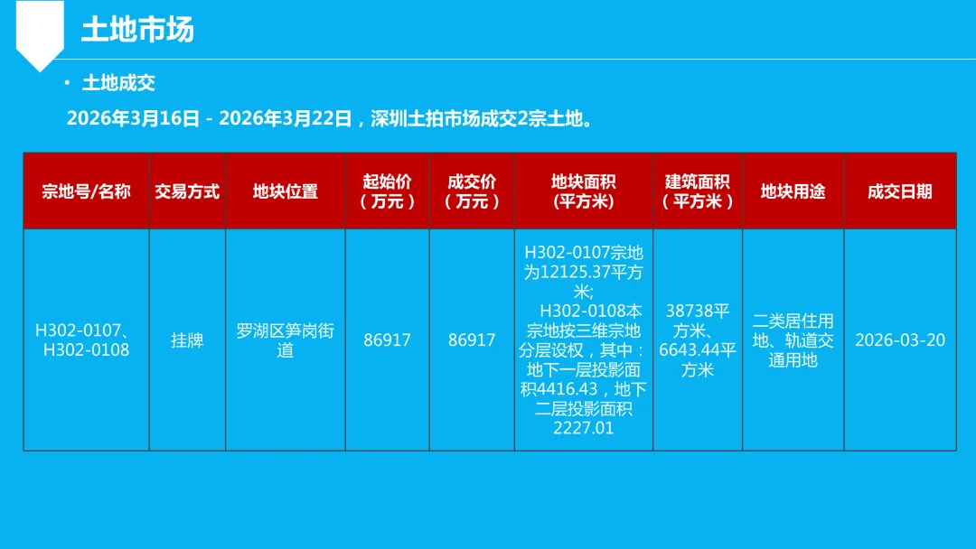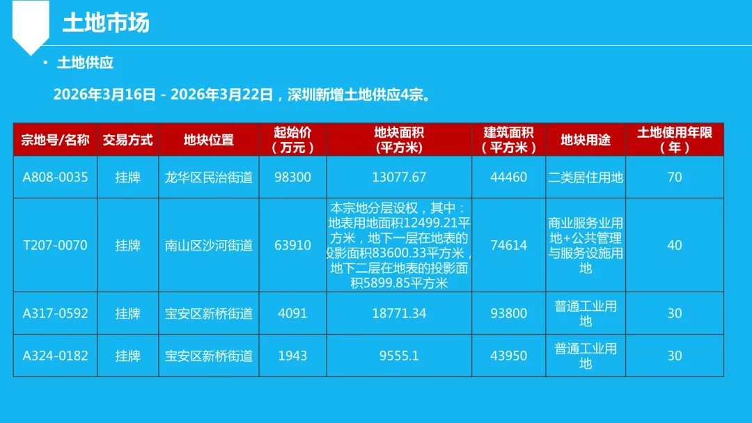 2026 年 3 月 16 日,深圳市规划和自然资源局同步发布年度建设用地供应计划、土地整备计划、土地储备计划三大文件,首次实现土地资源 "整 — 储 — 供" 全环节联动编制。核心要点:全年供应建设用地 1068 公顷,建立2026-2028 年土地储备三年滚动项目库(含 1920 个项目、总面积 6031 公顷,其中新增 650 个项目、面积 1861.52 公顷),为 "十五五" 开局筑牢空间根基。