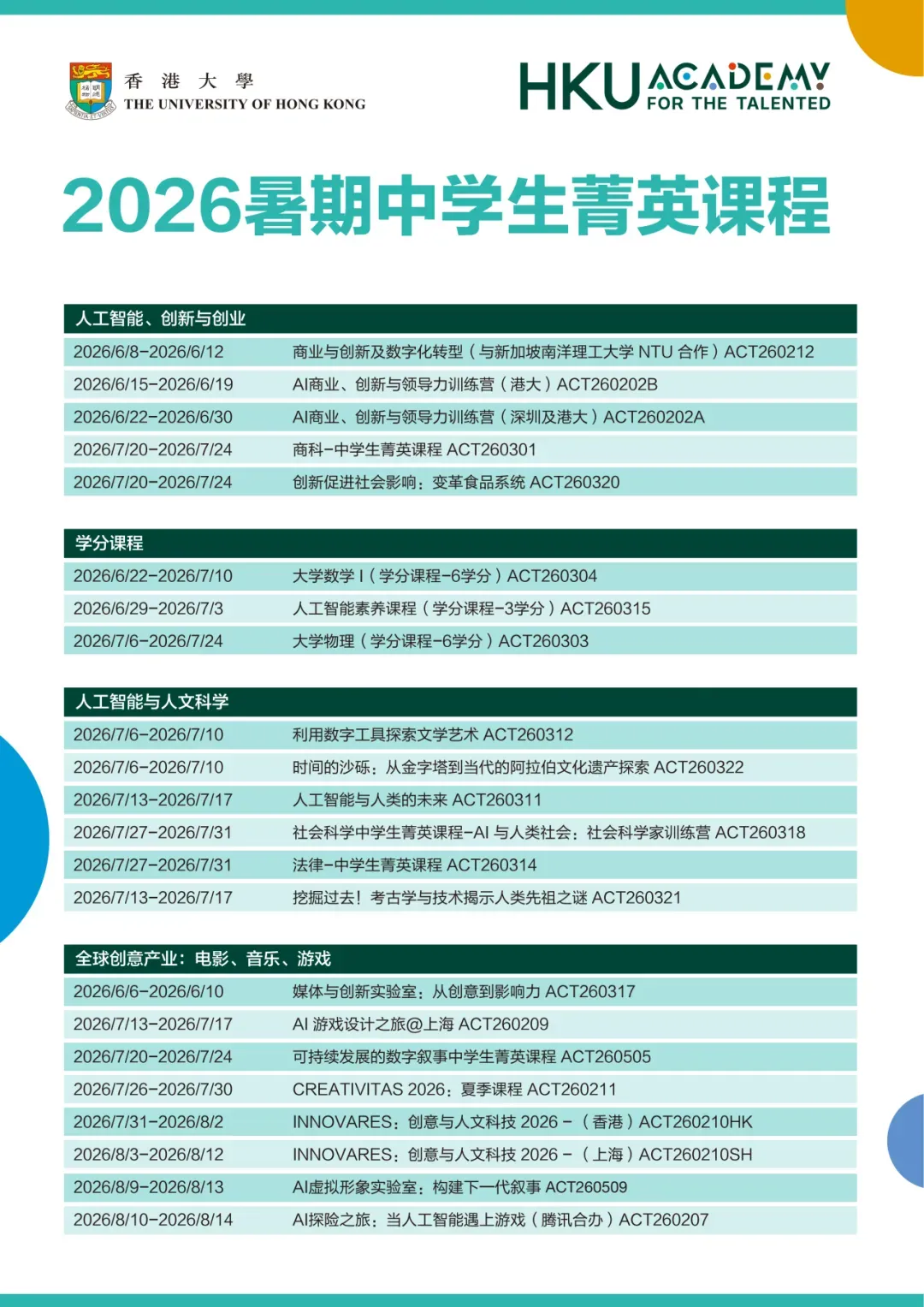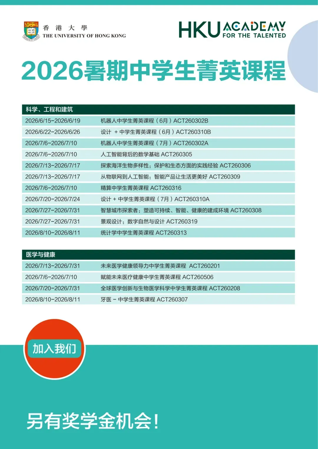 这个盛夏,香港大学2026年暑期中学生菁英课程邀你入局,六大热门领域全覆盖,港大教授与行业专家亲授,更有专属奖学金助力成长,开启你的暑期学术进阶之旅!