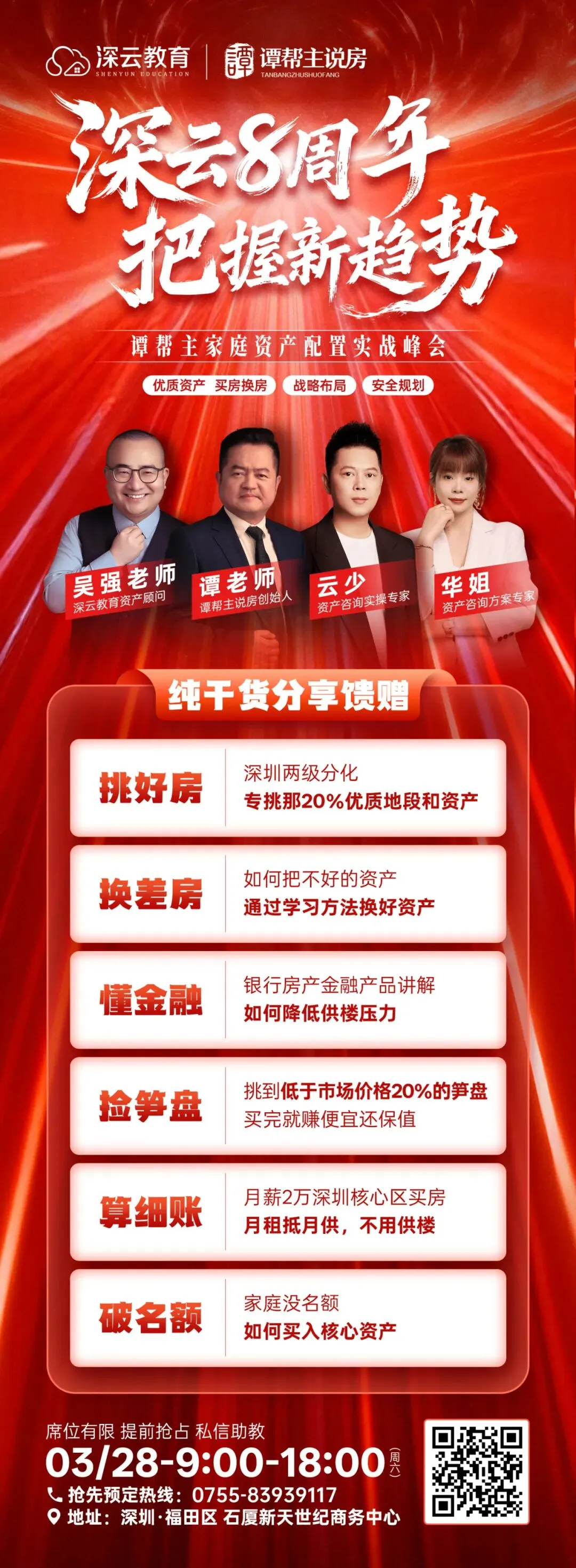 3月28日,深云八周年,我会举办“谭帮主家庭资产配置实战峰会”,为你讲解2026年新的市场形势,和房价涨跌买卖策略。