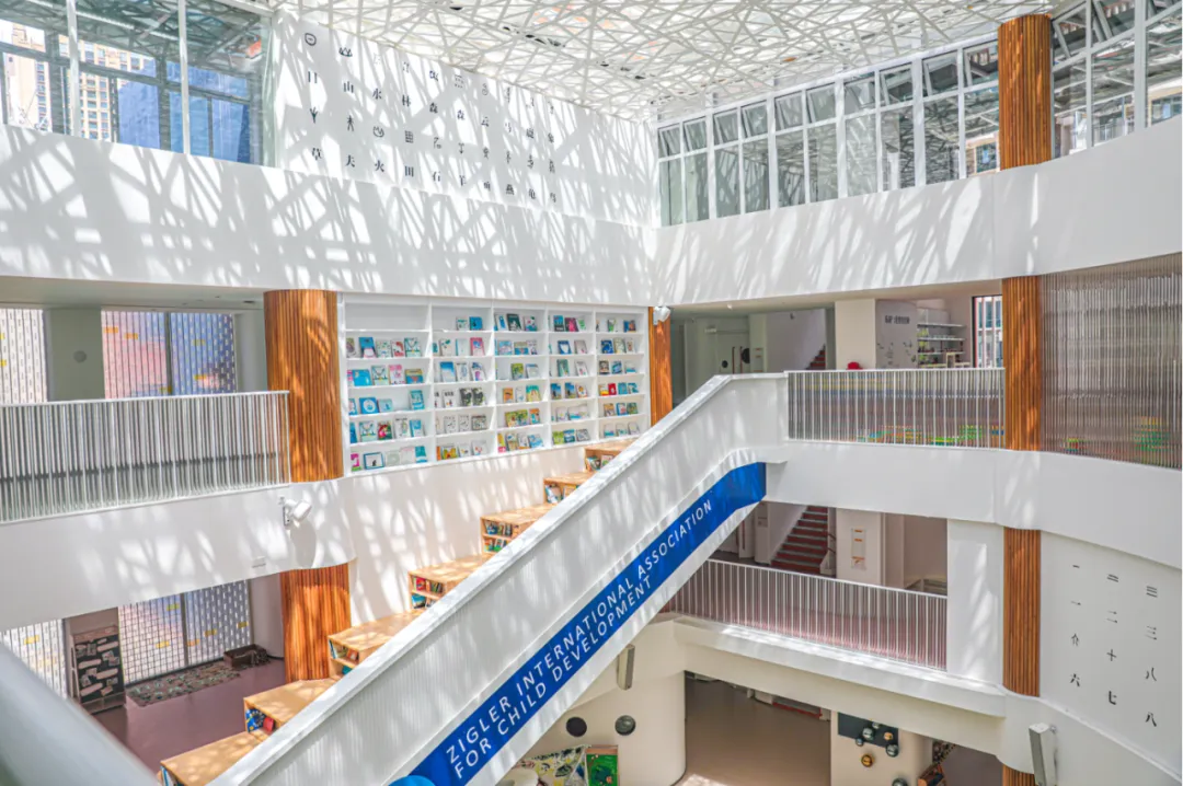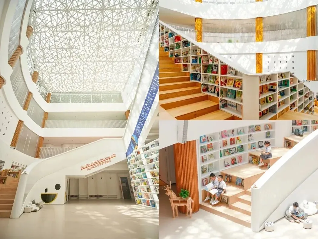 中庭为三层楼的开放式空间,屋顶采用镂空设计,透过玻璃穹顶将日光引入室内,通过图书馆柔和的光和影的交织迁移,不仅能够刺激孩子的视觉神经发育,还能激发孩子的好奇心和探索欲。