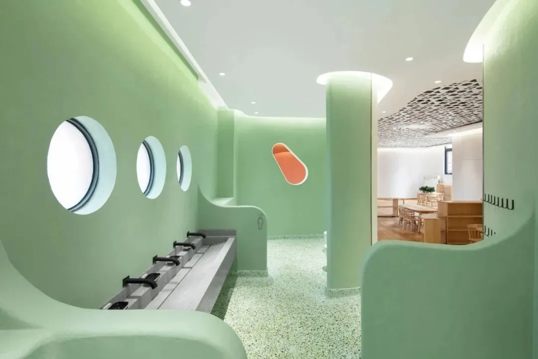 而所有的教室都有独立的男女洗手间,按照孩子的身高尺寸来设置的洗手池、用餐区、学习区、绘画区……通过恰当的分区,让孩子们能够专注各自的学习游戏。