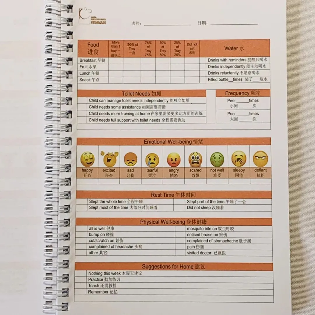 科发的双语环境和高师生比在福田国际园中一向是有口皆碑的。除了国学课和食育课堂等部分特色课程需要用到中文教学,科发的其他时间都是全英文教学,给孩子带来沉浸式的英文环境。老师告诉我们,毕业班的孩子不仅有顺利通过贝赛思面试的,甚至小班的孩子在外面都能主动流畅地与外国人聊天,可见科发对孩子的英语能力的培养有多强!在科发,一个班会配备4位老师,其中1位是外教主班,1位是双语主班,1位是双语助教,还有一位保育员,师生比甚至能达到1:2-1:3,可以说是超高配比!确保给孩子带来精细到位的照顾。为了让家长掌握孩子的在校情况,老师会制作孩子在园的每日反馈册,其中记录包括了孩子的进食情况、上厕所频率、情绪、身体健康等内容。