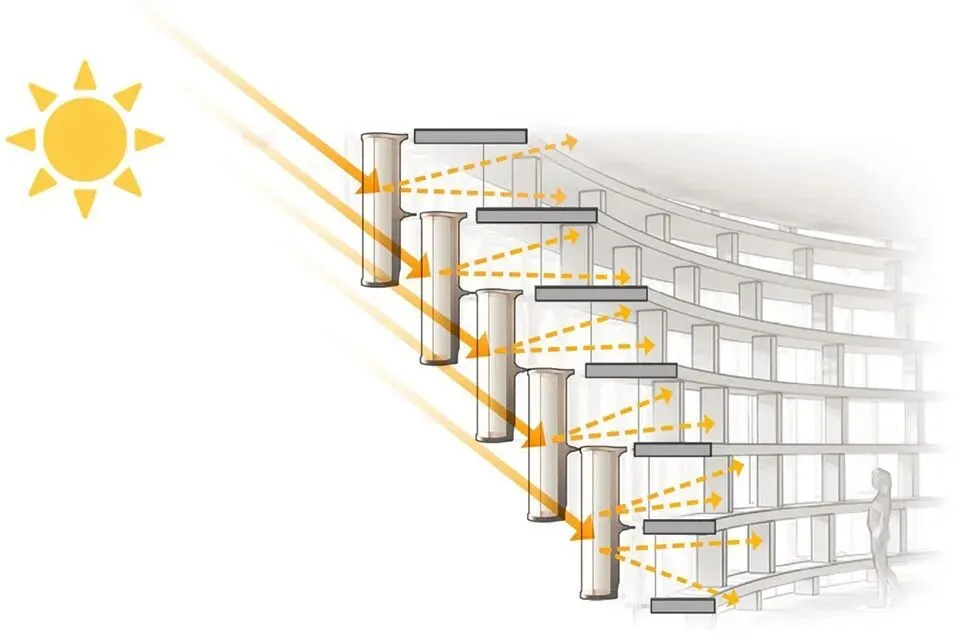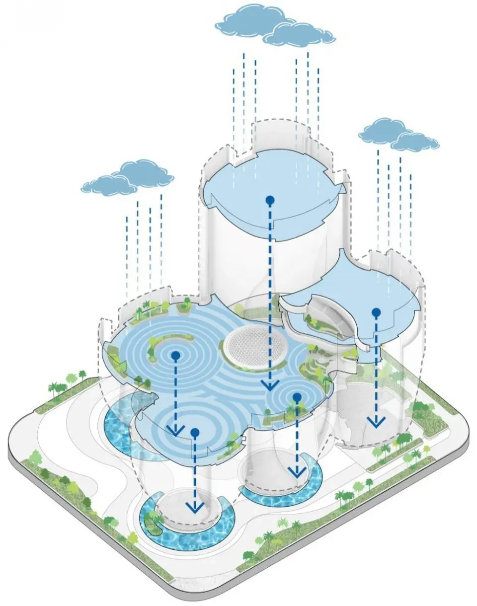 如同树木的枝叶,这些玻璃管为建筑提供遮阳、光线漫射与通风效果,显著提升建筑的能效,同时将柔和的自然光引入室内空间。锥形体量的屋顶可收集雨水,经处理后汇入地面蓄水池循环利用,呼应深圳“