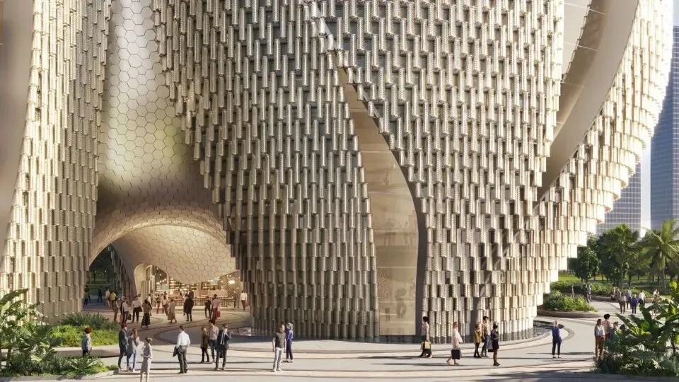 展览空间由五个雕塑感十足的亭阁结构抬升而起,这些结构以纤细的形态触地,在向上延展时逐渐展开,在深圳高楼林立的城市天际线中形成极具辨识度的形象。通过将建筑主体悬浮于地面之上,奥雷·舍人的设计释放出一个遮阳且自然通风的公共广场。