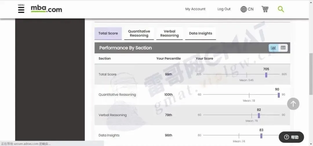 新版GMAT705分(Q90+V82+DI83),根据新老版的分数转换表,相当于老版GMAT750分!