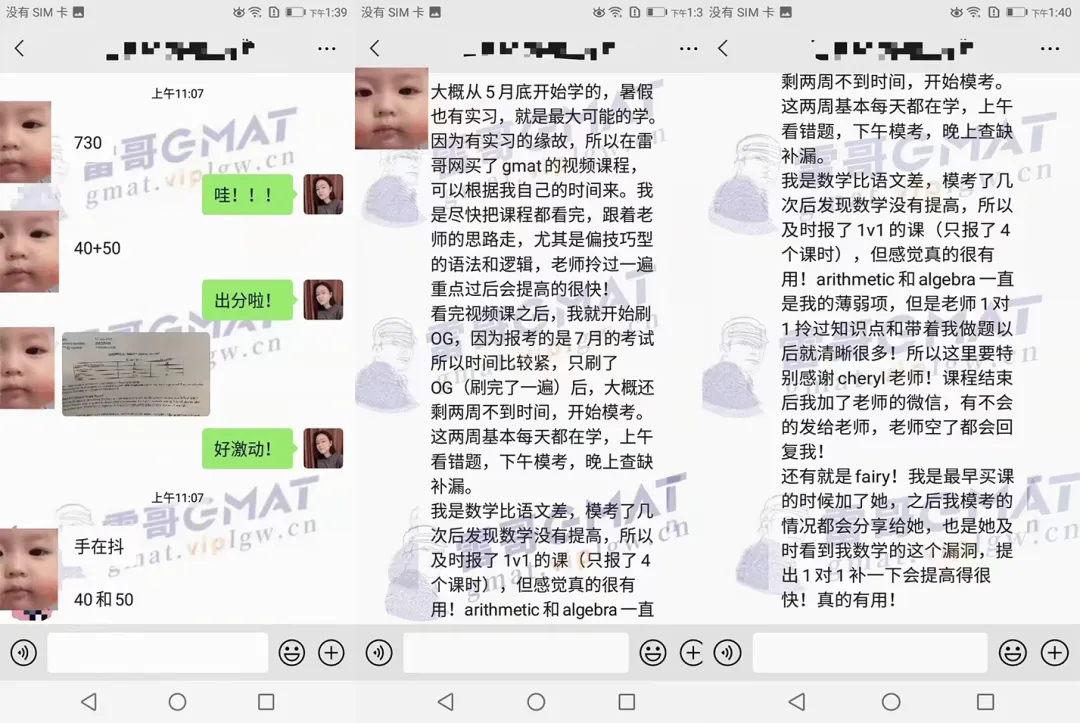 刘同学这次考试还是比较着急,就等着GMAT成绩去递交留学申请,还好成功出分,赶上了靠前的批次提交!在考前,老师们都很关注她的日常练习学习情况,也针对模考暴露的问题,提出了建设性的建议!