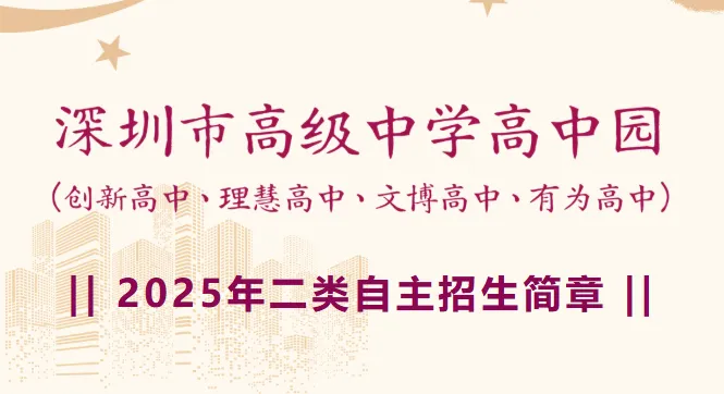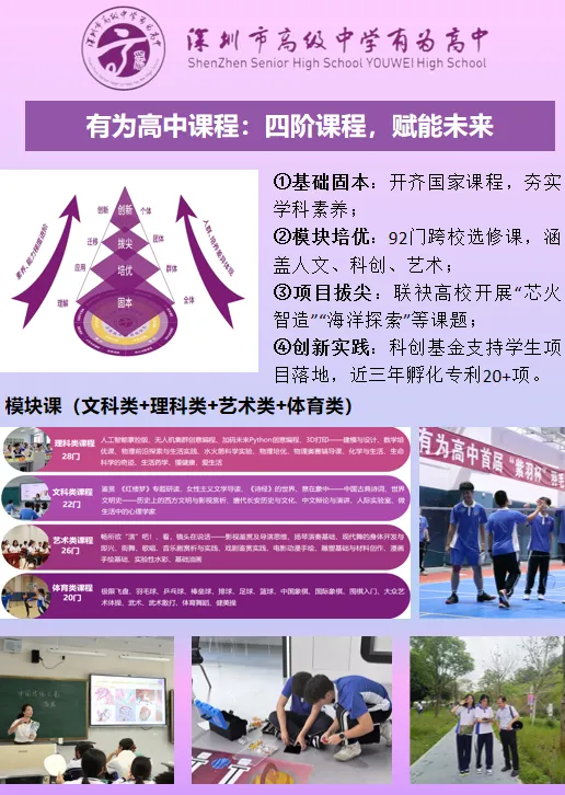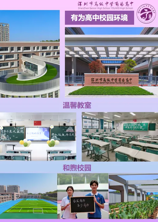深圳市高级中学有为高中是深圳市高级中学高中园内设4所公办高中学校之一。深高高中园四校一体、生生不息,秉持“融合新生态,共育新人才”的办学理念,集群整合高端资源,优势互助资源共享。基于体量整合资源,构建共生、共享、共创学校教育生态,集结多方智慧,寻求协同增效,促进最优化发展。