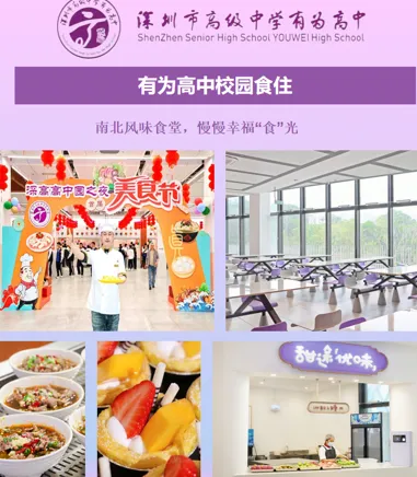 深圳市高级中学有为高中食堂自营,采用“自选餐+粉面档+套餐+煲仔饭+夜宵”自助模式,设有多个特色餐饮窗口,每日供应营养套餐、现制牛腩粉、武汉热干面、川味麻辣烫、柳州螺蛳粉、广式蒸点等品类,搭配新鲜果蔬吧与低糖甜品区,构建科学膳食体系。