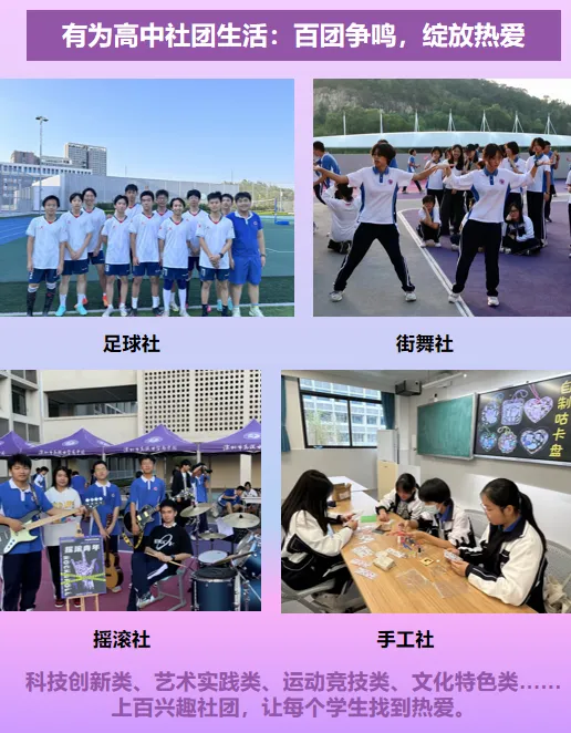 深圳市高级中学有为高中,学子可以与志同道合的小伙伴一起探索缤纷社团,遇见每一种兴趣与热爱!