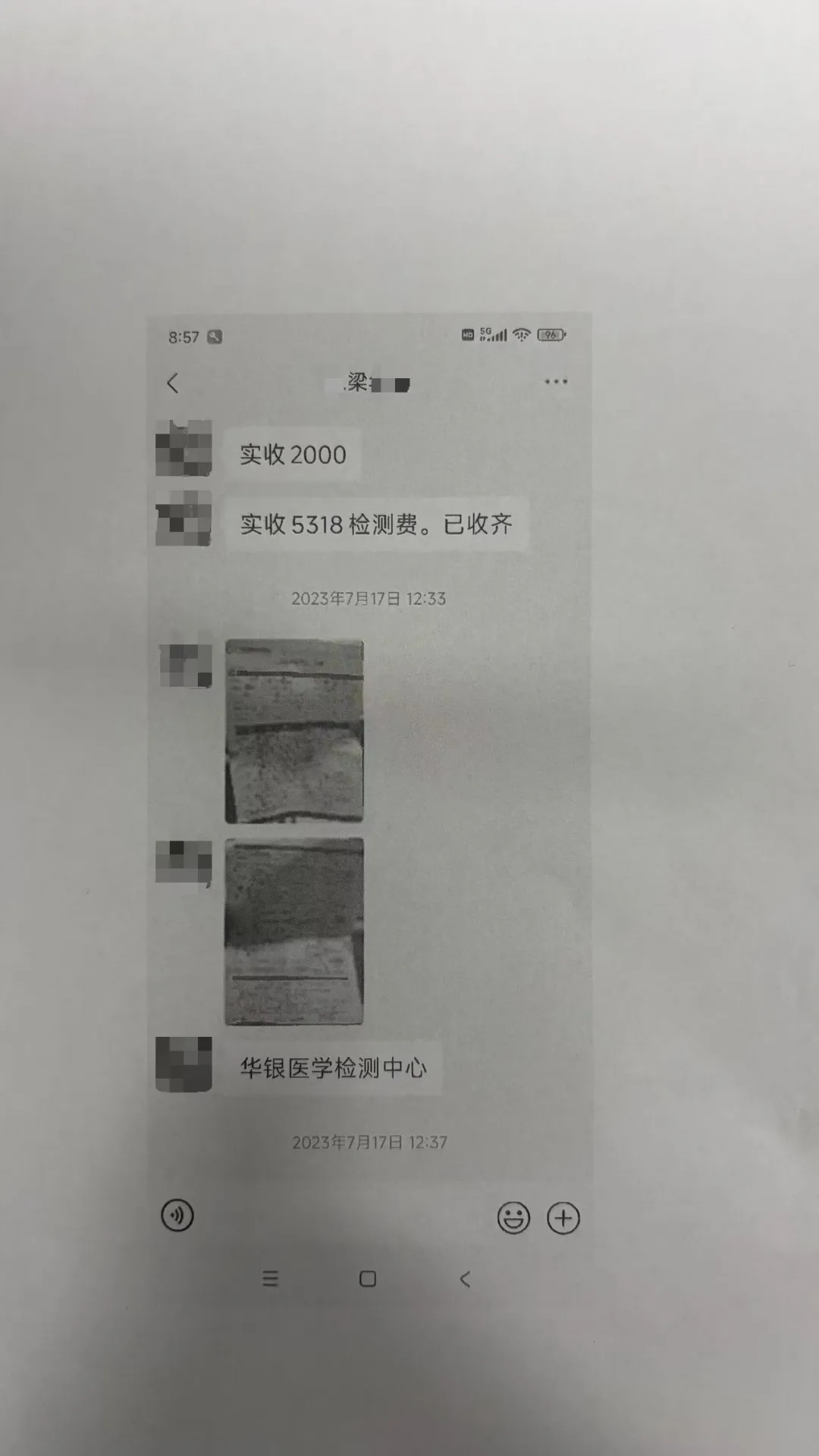 2026年1月,小王在其家属的陪同下,来到报社进行投诉,并向记者提供了相关证据材料,包括相关检测报告、与梁先生的微信聊天记录、转账凭证以及报警回执。聊天记录显示,梁先生明确送检机构为“华银医学检测中心”,并提供了该中心的检测申请单。