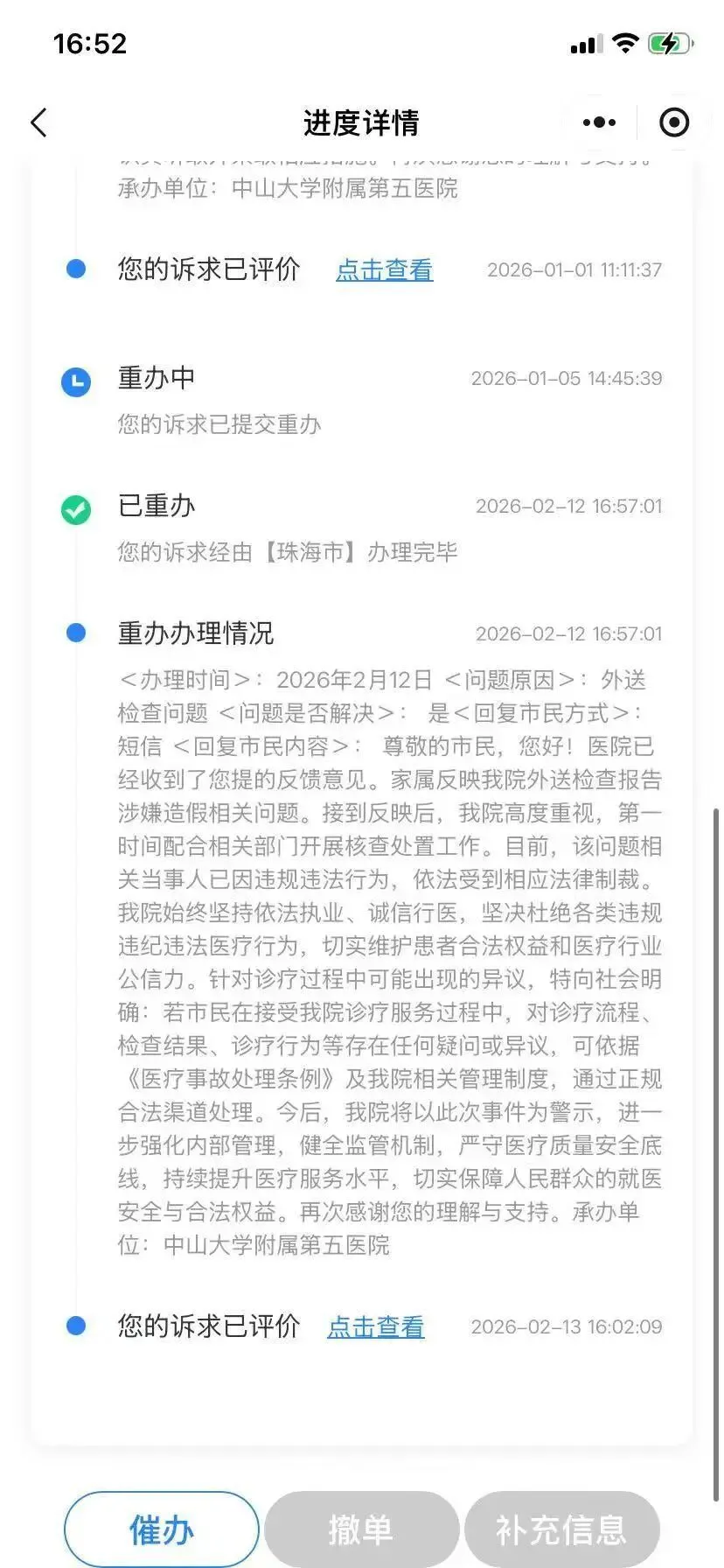 记者获悉,在患者家属向12345平台投诉后,2026年2月12日,患者收到平台的回应。中山五院院方在回复中表示:医院始终坚持依法执业、诚信行医,坚决杜绝各类违规违纪违法医疗行为,切实维护患者合法权益和医疗行业公信力。并以此次事件为警示,承诺将进一步强化内部管理。