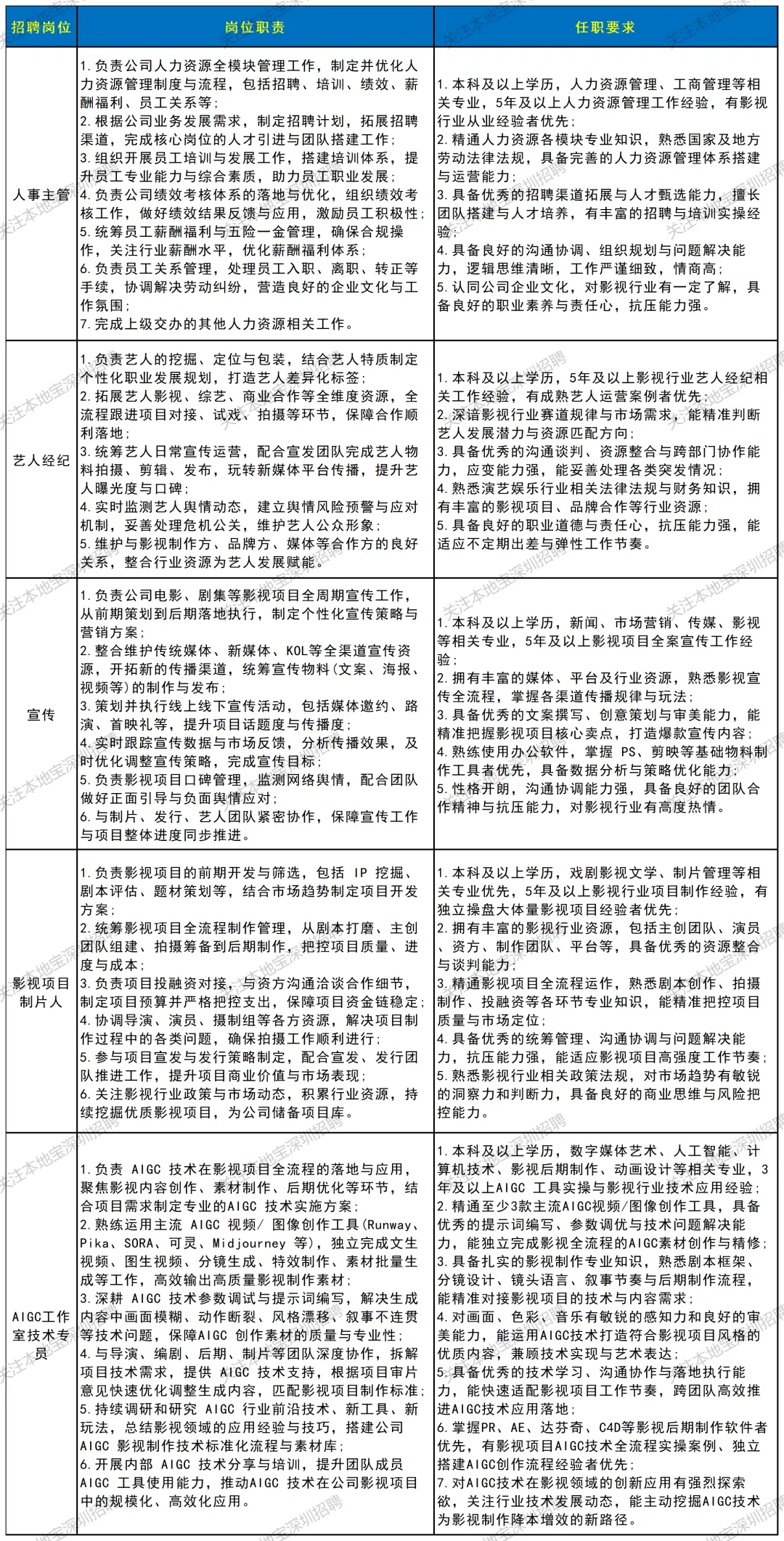 招聘人事主管、艺人经纪、宣传、影视项目制片人、AIGC工作室技术专员,具体要求如下图所示