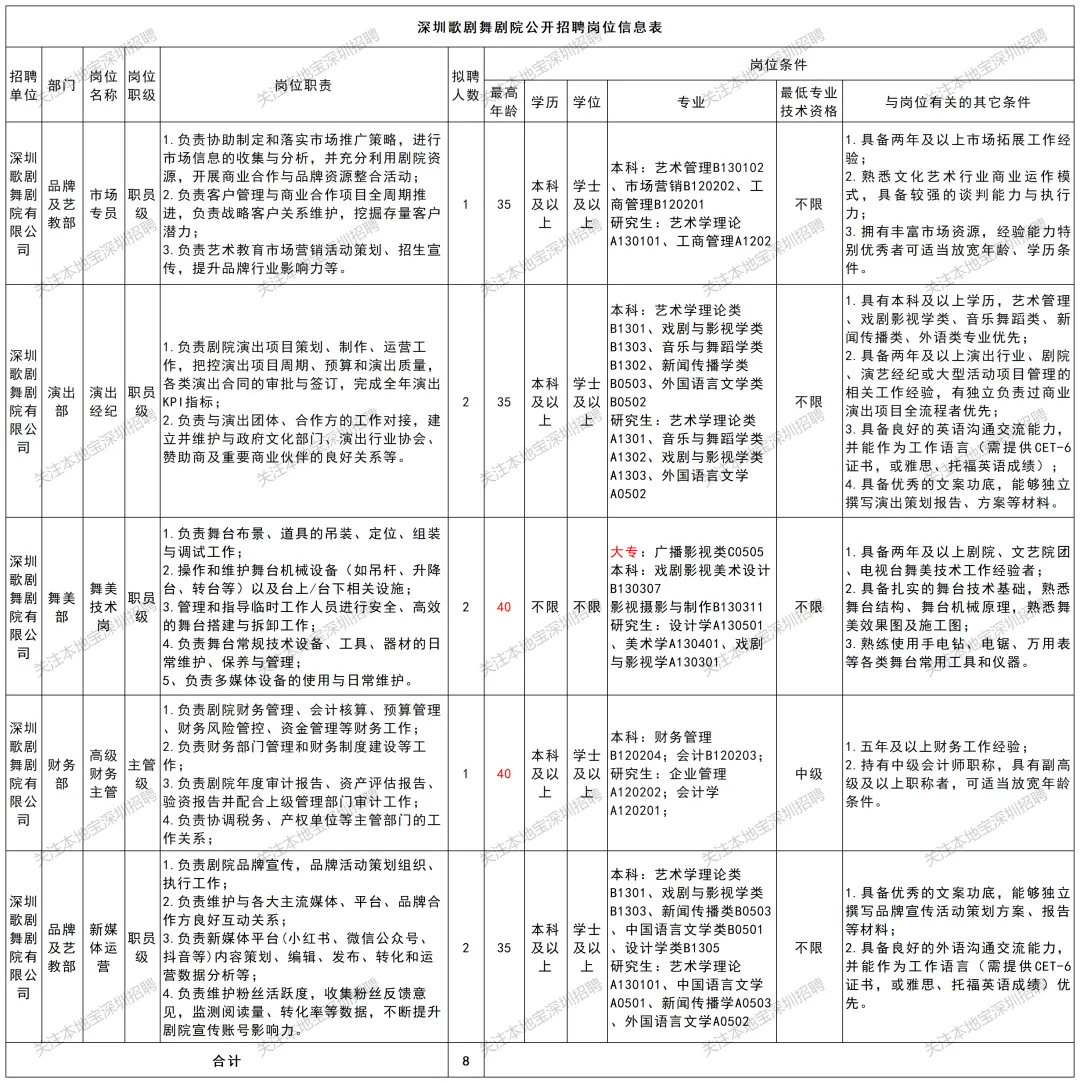 招聘市场专员1名、演出经纪2名、舞美技术岗2名、高级财务主管1名、新媒体运营岗2名,大专有岗,具体要求如下图所示