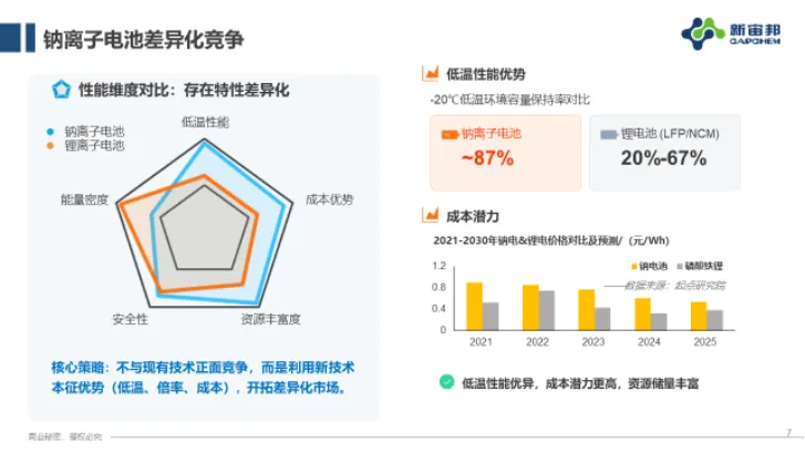 其实可以看到,在一些应用场景,钠离子电池的验证已经走通了,比如说摩托车企业,小的超低温应用场景下正在小规模的走通,对于钠离子电池来说,我们认为它要走差异化竞争,差异化竞争最核心的点,它跟锂电差异在哪?它能够占据哪些锂电不能占据的市场?我们可以看到,-20℃低温保持率87%,确实比磷酸铁锂本体要好,我们不考虑系统和电芯设计的时候,同比情况下要好很多。另外是成本潜力,就是说钠资源比较丰富,碳酸钠成本可能几千块,比碳酸锂有巨大的成本潜力在这个地方。