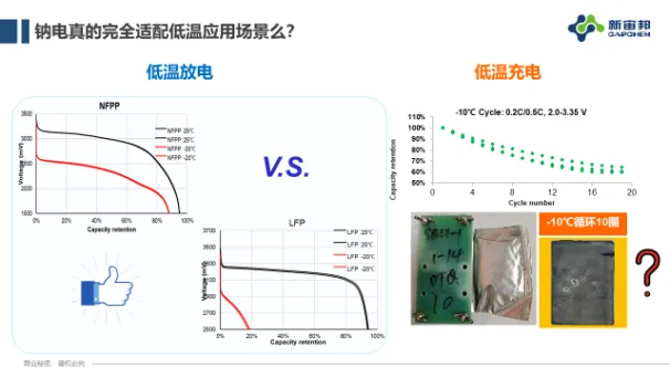 我们是做电解液的,做电解液的时候就在考虑,我们认为钠电会去做差异化竞争,低温是它的应用场景。钠电低温真的是完全好吗?我们来看它的低温放电,确实是很好的,相比于磷酸铁锂在-20℃可能就20%左右(小电芯、单极耳),钠电不做任何处理情况下可以放出接近90%的容量。如果看它的充电呢?我们知道一个应用场景,不仅仅只是放电,它会有充电的场景,在这个场景下不需要人过去干预就能运行,所以低温至少在某些应用场景下是必要的。我们做了一个尝试,低温20周,容量保持率60%,并且这个电芯产气,拆电池,负极有明显的析钠现象。这样低温循环能力的变化来源于哪?我们做了一个很有意思的实验,我将低温充完电的电池,让它回到常温接着充,低温放电的电池,让它回到常温接着放,我来看看,回到常温以后有没有新的容量充进去或者释放出来。