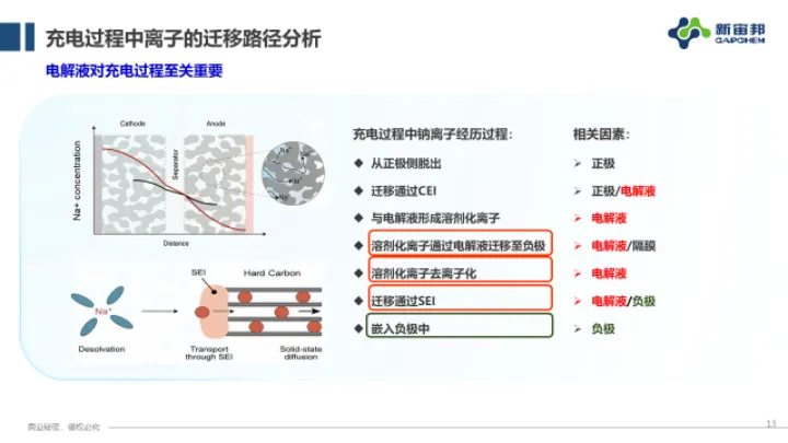 我们要改的是它的充电过程。充电过程能干嘛?充电过程钠离子发生什么变化?正极侧从核心物质材料中脱出,迁移到CEI,迁移之后与电解液形成溶剂化离子,然后从正极迁移到负极,在负极侧表面去溶剂化,通过表面SEI膜再嵌入负极当中去,这么一个过程。