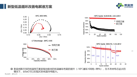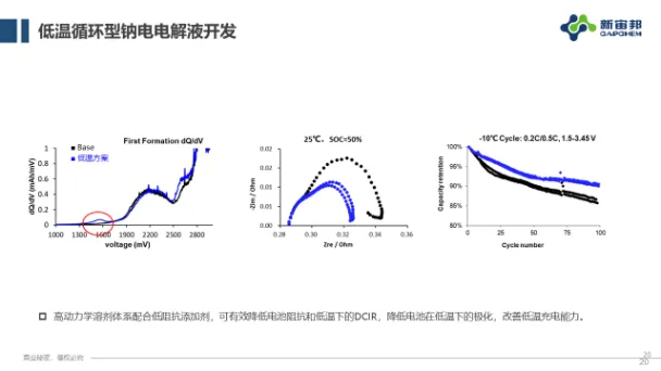 其实对于提升低温循环的电解液来说,目前的角度最合适的就是高动力学溶剂配合低阻抗体系,同时再去兼顾高温方面所带来的风险,这是我们相对比较成熟的低温电解液解决方案。从结果来说,它的DCIR,低温放电,低温充电都表现出了明显的优势。在高温方面,通过专门电解液优化,高温方面可以保持不变。简单打一个广告,新宙邦是一家专门从事电子化学品和功能材料公司,电解液是我们主营业务之一,现在你想要的钠离子电池,我们都有对应的电解液,层氧的,聚阴的,高倍率型的,高压层氧都有相关产品。很多时候我们更侧重根据客户的需求提供产品+解决方案,一方面根据你的需求定制产品。另一方面在原材料供应、产品开发、运输、一体化服务,生产过程当中遇到所有电解液问题,我们都会提供服务。