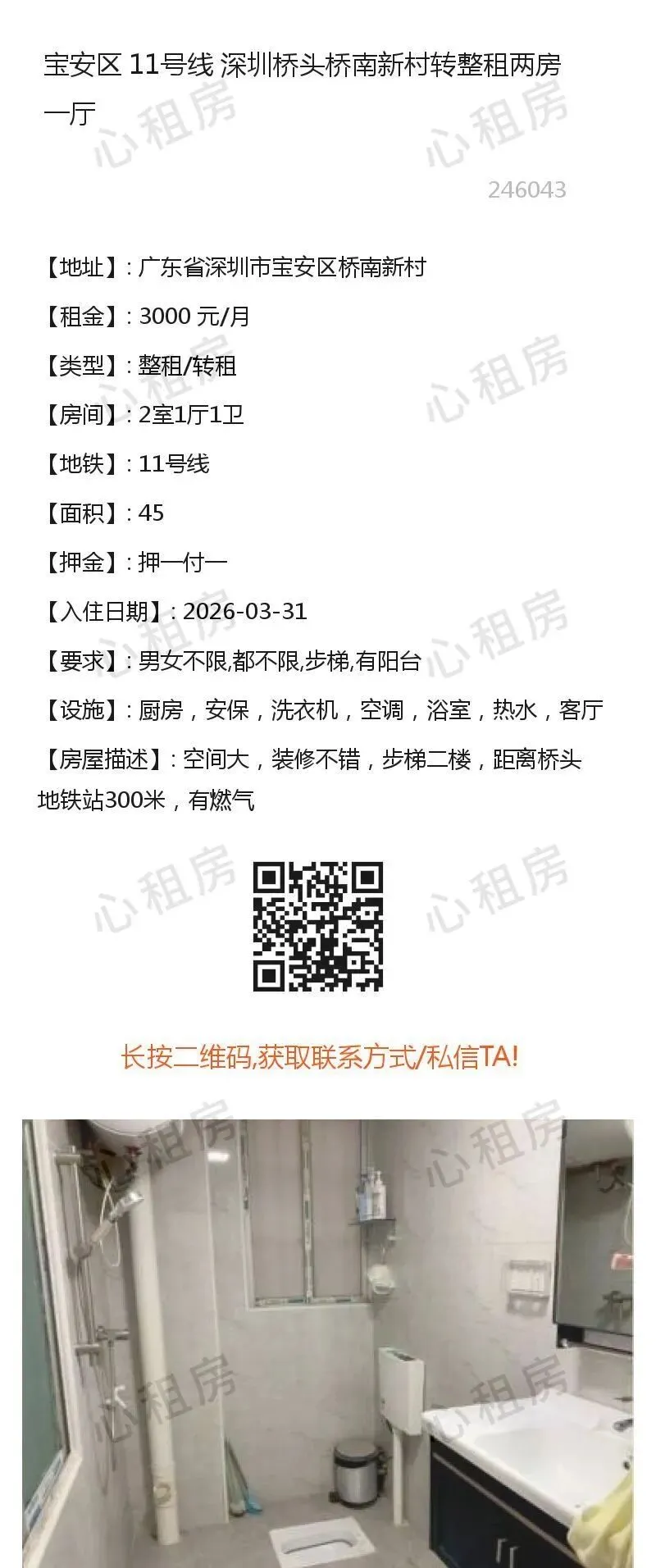 深圳租房【宝安4则】房源①:11号线深圳宝安桥头桥南新村转整租两房一厅3000元/月;房源②:…