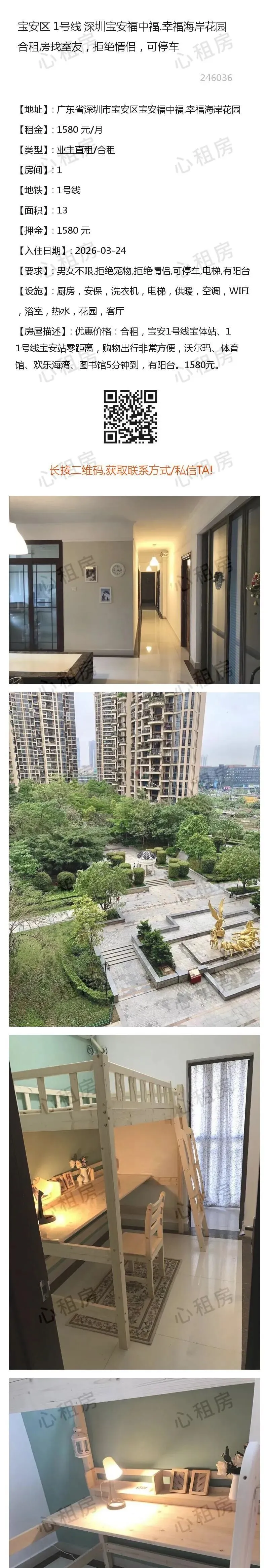 深圳租房>>宝安区1号线深圳宝安福中福.幸福海岸花园合租房找室友,拒绝情侣,可停车1580元/月