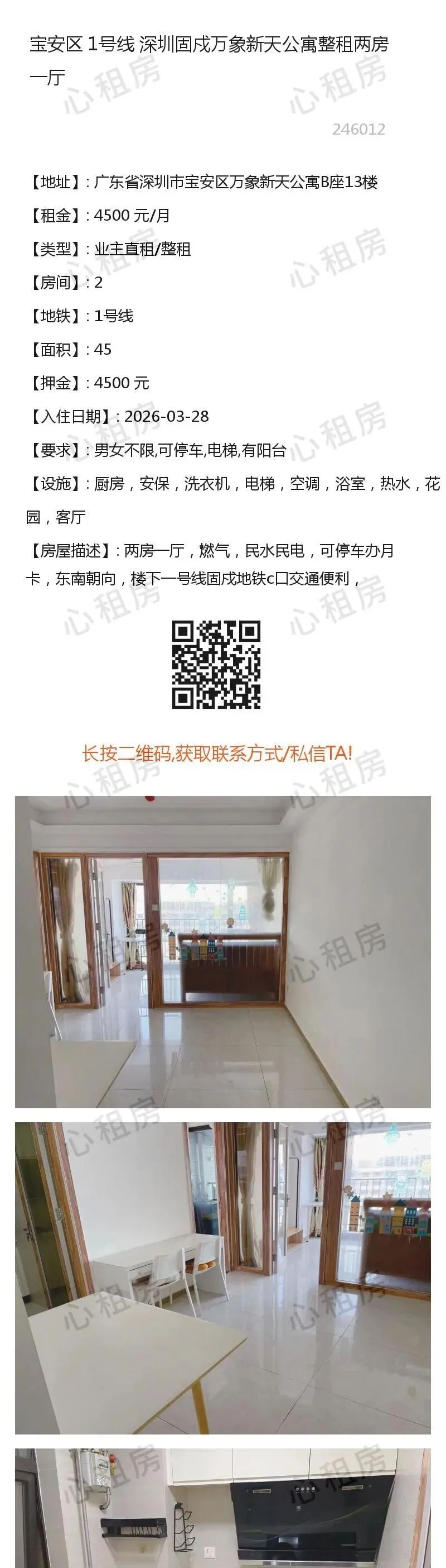 7、近期有人冒充我团线下工作人员,在此特别提醒:本公众号/心租房(homhere.cn)仅提供信息发布,不存在线下工作人员提供服务,请务必谨慎、切勿上当被骗。8、切勿轻信他人,点击他人提供的链接、二维码等,切勿按照他人指示提供验证码、进行转账等操作,谨防上当受骗。9、如遇提供虚假信息、冒充我团工作人员、引诱点击其他网站链接、实施诈骗等行为的,请及时在本公众号对话框里回复:Y,与我团客服联系。 查看不同房源→→深圳心租房公众号