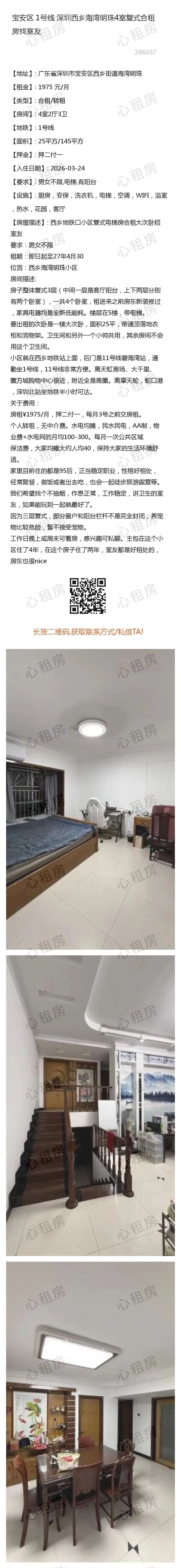 深圳租房>> 宝安区1号线深圳西乡海湾明珠4室复式合租房找室友1975元/月