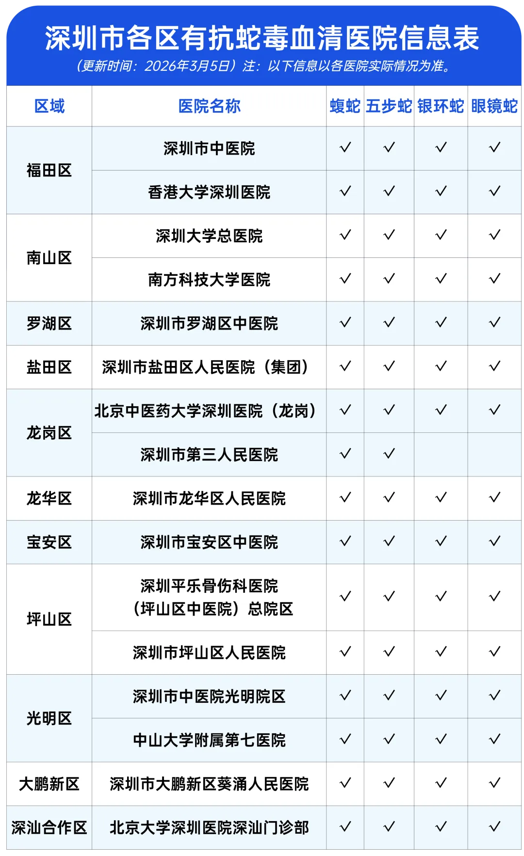需要提醒的是:抗蛇毒血清属于特殊医疗资源,库存可能随时变化。大家如有需要,请第一时间拨打120急救电话,呼叫救护车送到有救治能力的定点医院。自行前往医院者,请选择以上蛇伤救治定点医院,并在就诊前致电相关医院核实血清库存及可适用的蛇毒种类,以免耽误最佳救治时机。