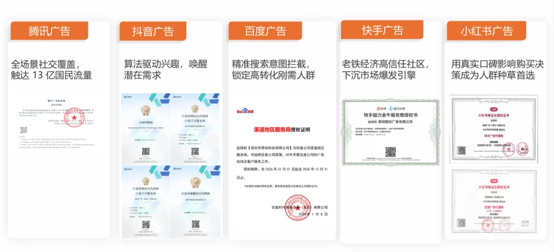 自2015年起步,厚拓科技已深耕行业十一年,与腾讯、小红书、字节跳动(抖音)、百度、快手、京准通、华为等主流媒体平台深度合作。手握全国范围的多平台官方媒体牌照,是腾讯、小红书、巨量千川、快手磁力金牛等平台的核心服务商。