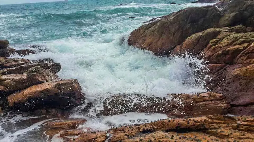 咸湿的水雾扑面而来,瞬间打湿了额发与睫毛,海浪的轰鸣早已抢先刺破耳膜 —— 那不是海岸边温柔的轻吻,是亿万年从未停歇的硬碰硬,是山与海最原始的博弈。顾不上沉醉,我赶紧抠住岩缝向上攀爬,这才懂了牛奶排 “踏浪攀岩” 的真谛:没有人工铺就的台阶,只有被海浪泡得滑溜溜的岩块,每一步都得小心翼翼找好着力点,指尖抠进岩石的凹槽,脚掌死死贴住岩面,生怕一个打滑,就跌进那片汹涌的青绿里。