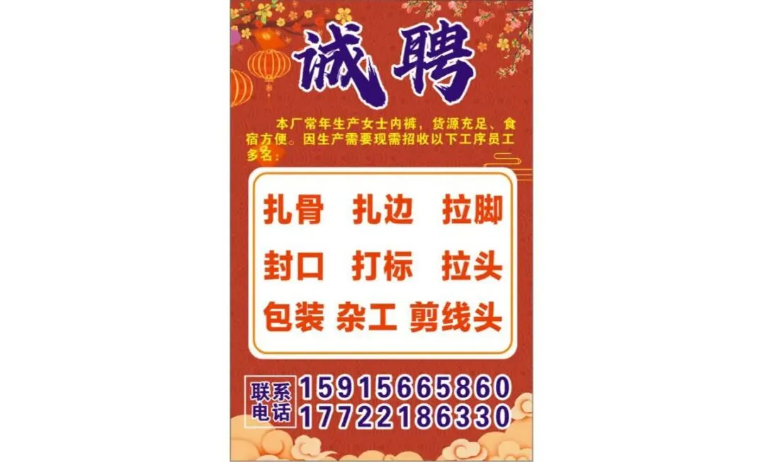 本厂长期生产女装内裤,货源充足,现招聘以下工序:扎骨、拉脚、露骨、人字、封口。(生手可学,熟手可以搬回家)