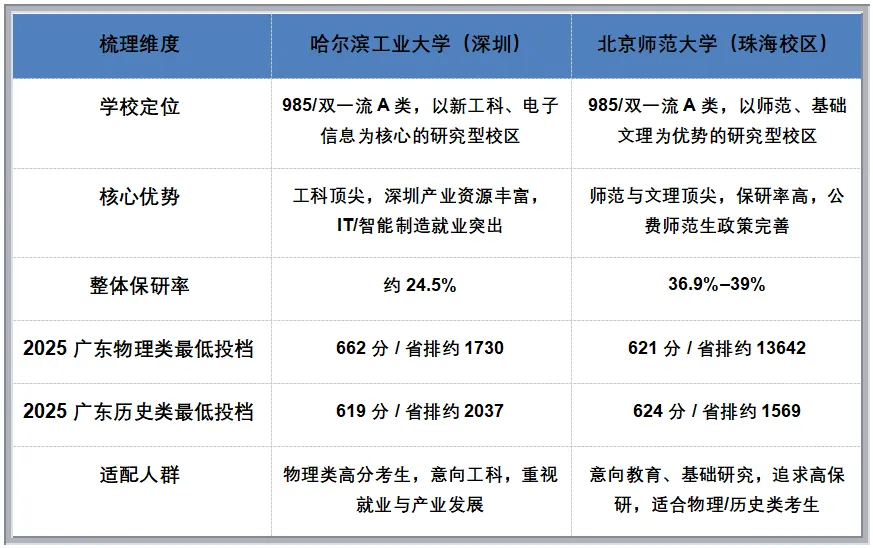 📊 数据来源:广东省教育考试院、哈尔滨工业大学(深圳)本科招生网、北京师范大学(珠海校区)本科招生网及教育部学科评估官方结果。