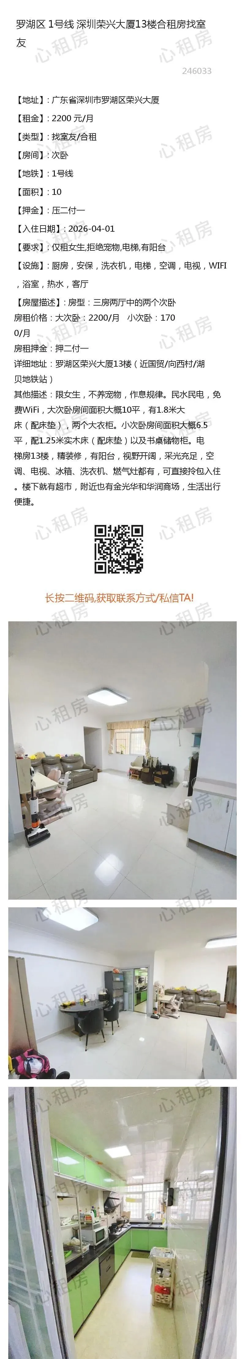 深圳租房【罗湖3则】房源①:1号线深圳罗湖荣兴大厦13楼合租房找室友2200元/月;房源②:…