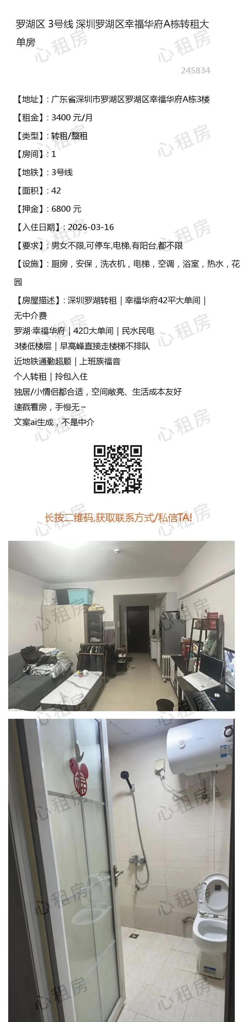 深圳租房黑房东找房子罗湖合找室友合租短租深租房科技园深大豆瓣南山租房地铁租房龙华新福田罗湖光明新区坪山新区大鹏南山豆瓣1、所有房源信息均由网友投稿,委托本公众号/心租房(homhere.cn)发布,房源的真实性、合法性由提供者负责。2、请务必核实双方身份信息(身份证)、房产权属(产权证明)、转租权利(租赁合同)等基本信息。3、请务必实地考察房源并确保与出租方提供的基本信息一致。4、切勿轻易支付定金、保证金、打赏等,建议签订《租赁合同》后再进行交易。5、双方在房屋租赁过程中产生的一切纠纷,均与本公众号/心租房(homhere.cn)无关。6、近期欺诈团伙在境外以相亲交友、租房、国际包裹等名义实施杀猪盘、诱导下载未知app等进行刷单返利等欺诈的行为较多,请先确认对方身份,保护个人隐私和财产安全。