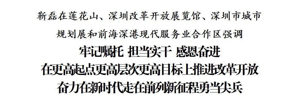 3月24日,深圳市委书记靳磊来到莲花山、深圳改革开放展览馆、深圳市城市规划展和前海深港现代服务业合作区,强调要以习近平新时代中国特色社会主义思想为指导,深入学习贯彻习近平总书记对广东、深圳系列重要讲话和重要指示精神,牢记嘱托、担当实干、感恩奋进,在更高起点、更高层次、更高目标上推进改革开放,奋力在新时代走在前列、新征程勇当尖兵。