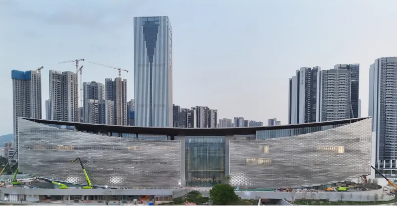 面对全国首例碳纤维拉索幕墙无先例可循的挑战,以及北馆立面双相不锈钢幕墙要求达1mm精度和南馆幕墙天然石材表面处理工艺复杂的多重工艺难题,光明区建筑工务署联合施工单位中建一局技术团队,迎难而上、合力攻坚,力求达到规划设计要求。