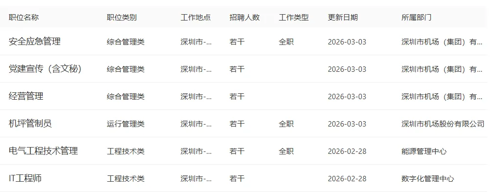 3月3日发布的岗位有:安全应急管理、党建宣传(含文秘)、经营管理、机坪管制员;