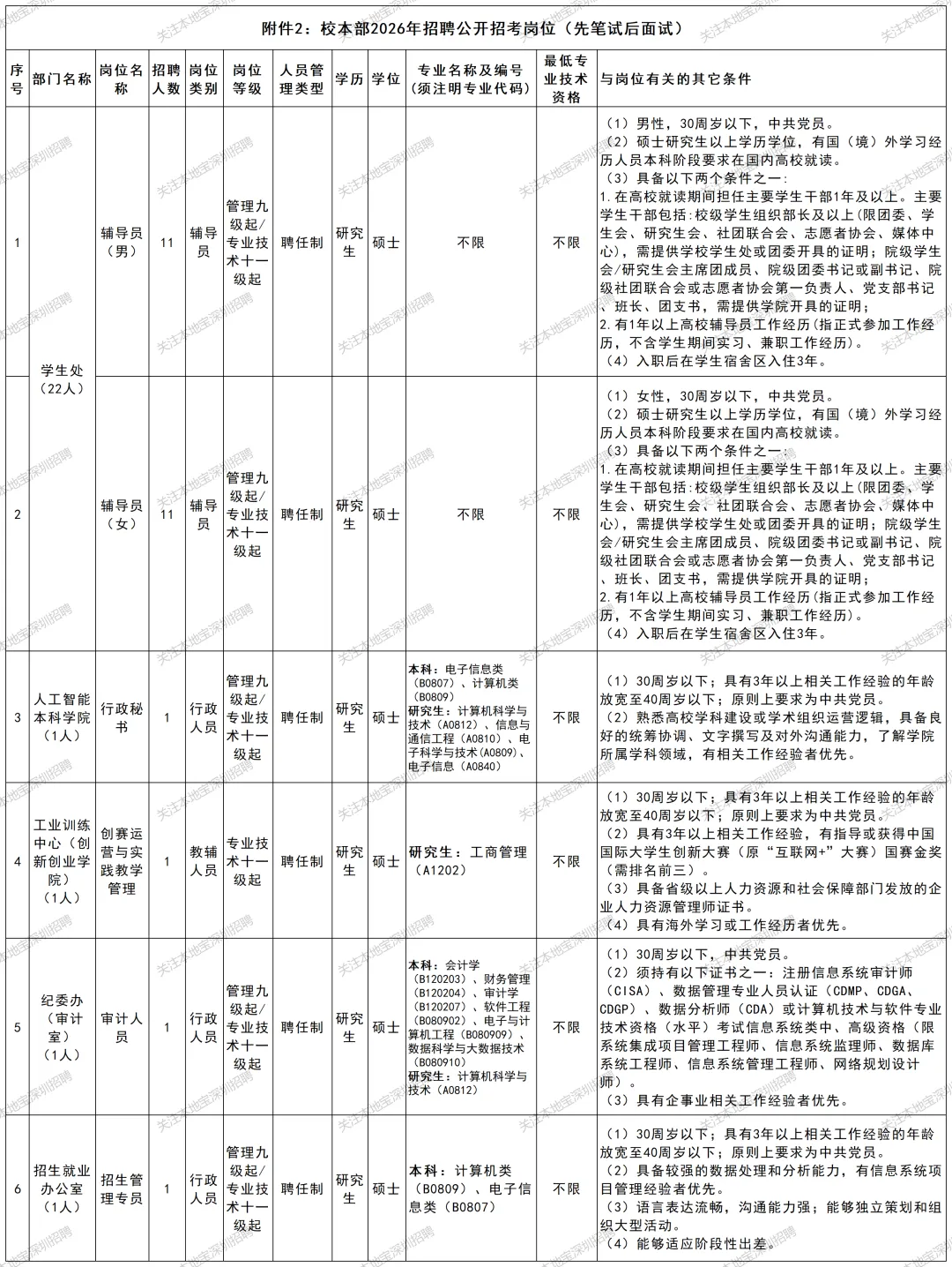 2.硕士等其他公开招考岗位:29人,其中专任教师2人、辅导员22人、行政教辅人员5人。详见《校本部2026年招聘公开招考岗位》(附件2、附件3)。