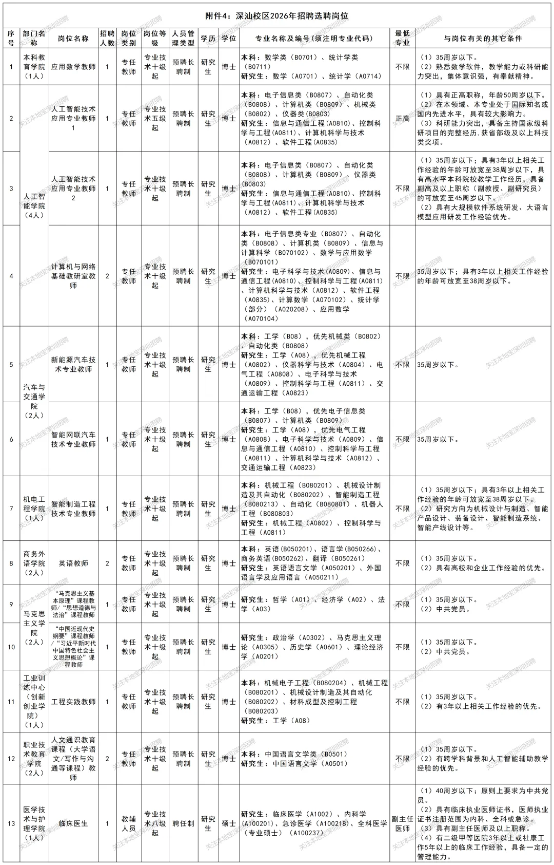 1.博士或副高以上选聘岗位:16人,其中专任教师15人、教辅人员1人。详见《深汕校区2026年招聘选聘岗位》(附件4)。