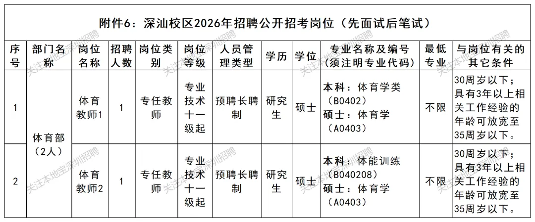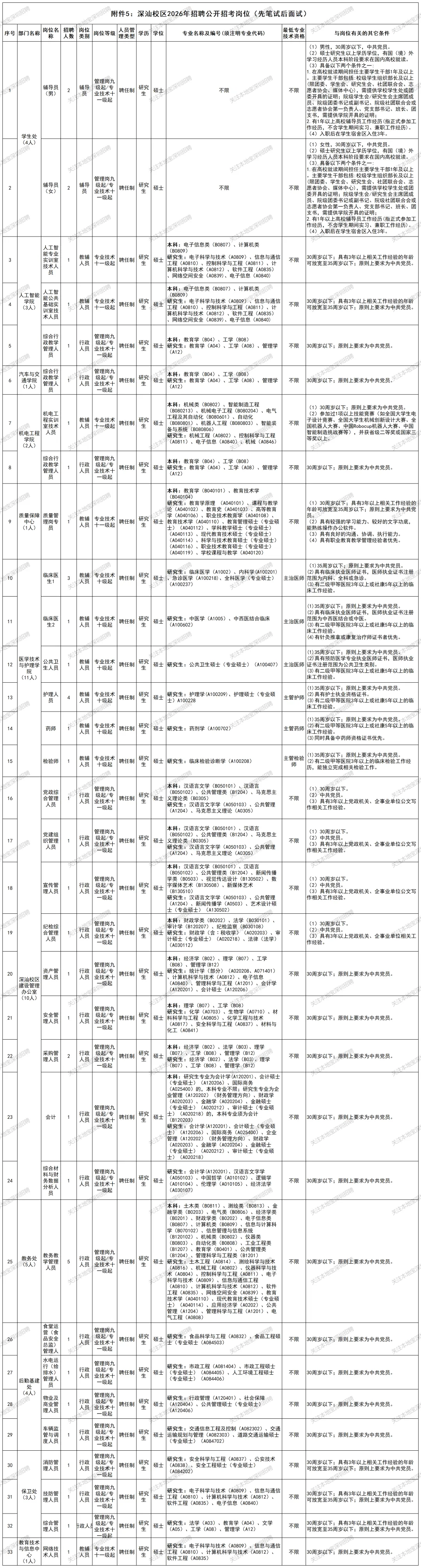 2.硕士等其他公开招考岗位:47人,其中专任教师2人、辅导员4人、行政教辅人员41人。详见《深汕校区2026年招聘公开招考岗位》(附件5、附件6)。
