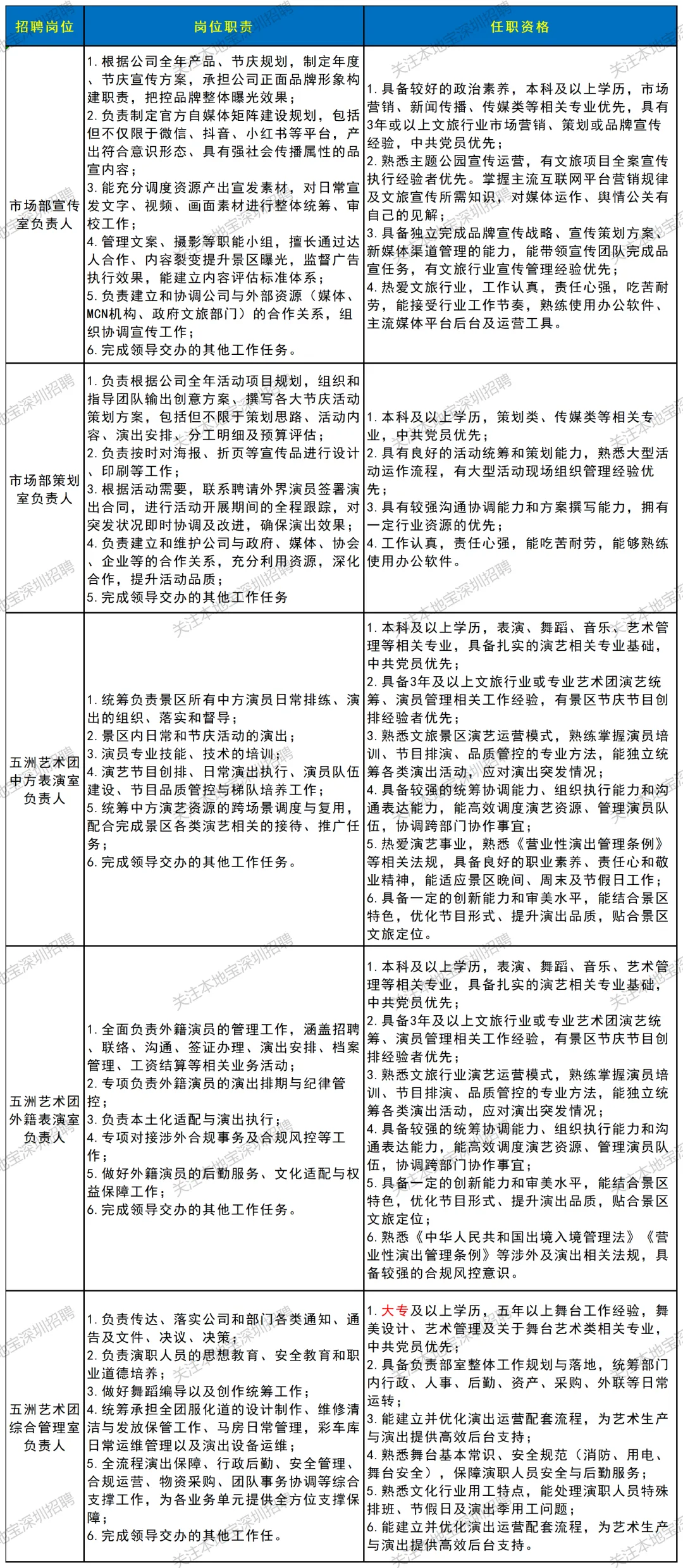 招聘市场部宣传室负责人、市场部策划室负责人、五洲艺术团中方表演室负责人、五洲艺术团外籍表演室负责人、五洲艺术团综合管理室负责人,具体要求如下图所示