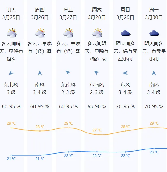 预计25日,多云间晴天,早晚有轻雾,气温21℃-29℃。